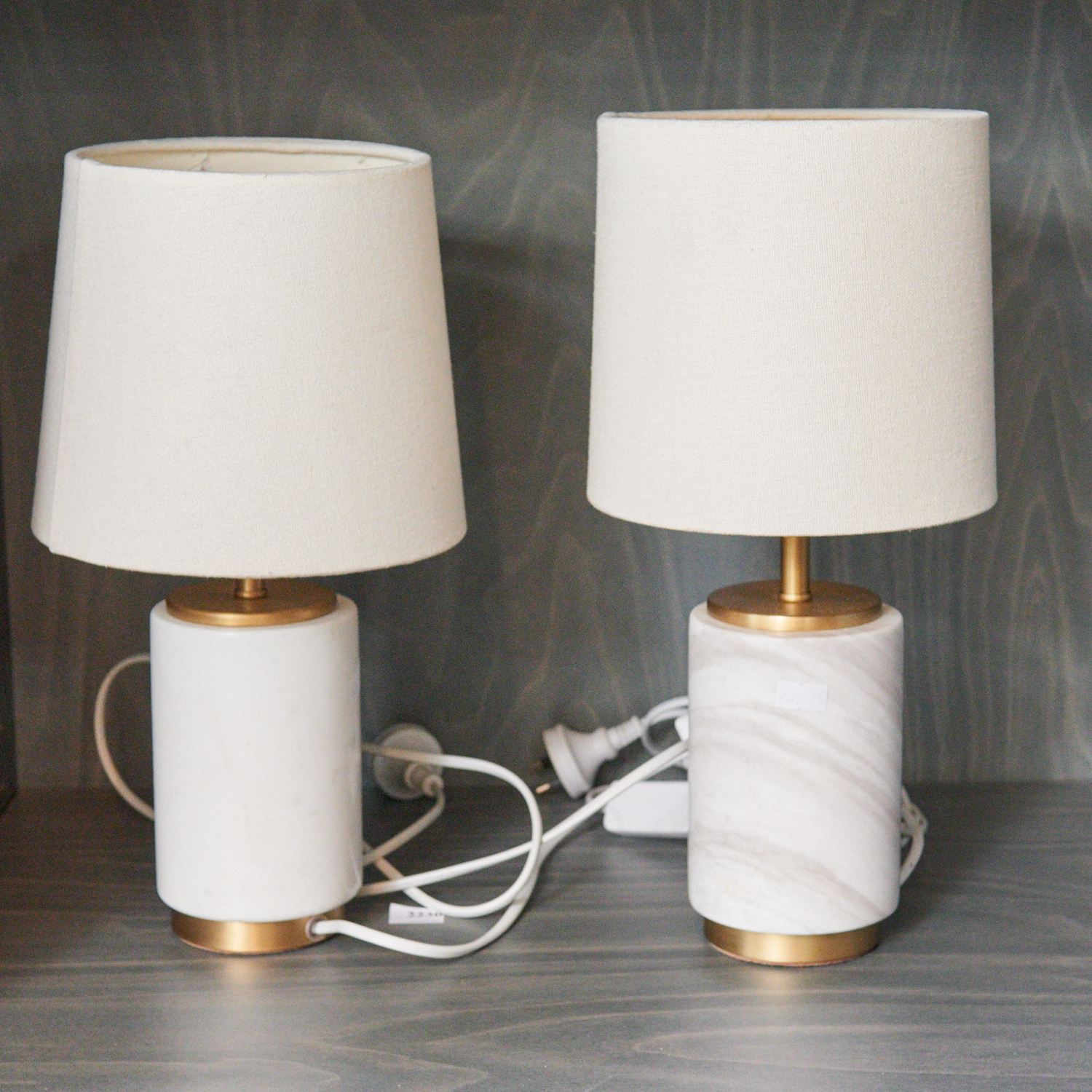 A PAIR OF MARBLE BASED TABLE LAMPS BY WEST ELM H.35CM, LEONARD JOEL DELIVERY SIZE: LARGE