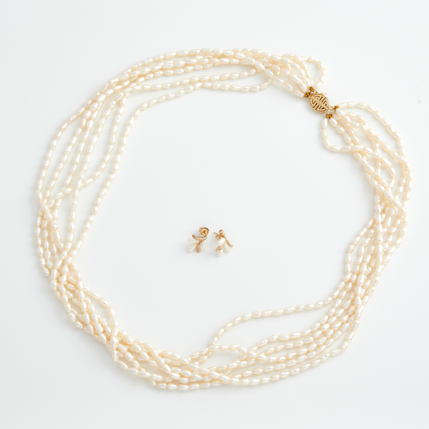A FRESH WATER PEARL SUITE IN 14CT GOLD, COMPRISING OF A MULTI STRAND NECKLACE TOGETHER WITH A PAIR OF EARRINGS TO POST AND BUTTERFLY FITTINGS, THE NECKLACE 610MM