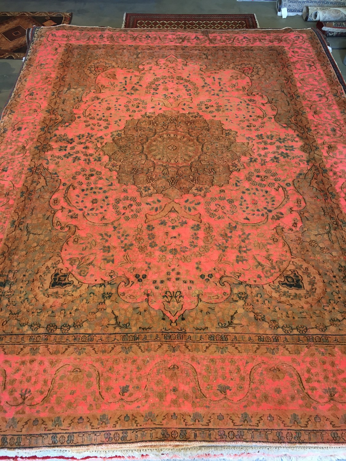 MODERN PERSIAN OVER -DYED VINTAGE SABZEVAR MASHAD CARPET, 100% WOOL. HAND KNOTTED WITH A CENTRAL MEDALLION ON A DEEP PEACH/ROSE FIELD. WITH ALL OVER FLORAL SPRAYS. IN TONES OF TAN WITH TEAL HIGHLIGHTS. SIZE: 391 X 287 CM ORIGIN: PERSIA - RRP: $5,900 CONDITION: CLEAN, EX GALLERY DOCUMENTATION OF AUTHENTICITY INCLUDED