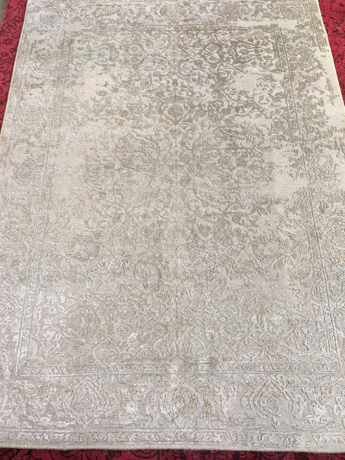 BRAND-NEW MODERN TRANSITIONAL DESIGN RUG, WOOL AND TENCEL SILK IN TONES OF SILVER AND GREY. CONDITION: MARKS ON BACK OF CARPET AND MINOR MARK IN FRONT. ORIGIN: INDIA – RRP: $3,300- SIZE: 173 X 236 CM