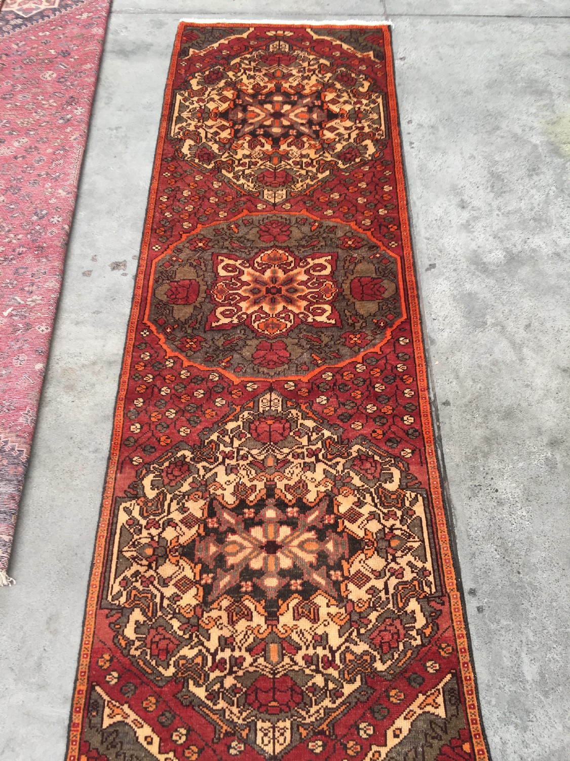 A CIRCA 1970'S PERSIAN BAKHTIAR RUNNER, 100% WOOL, NATURAL DYES. HAND KNOTTED TRIBAL BAKHTIARI WEAVE AND DESIGN OF CONTINUING BOLD FLORAL MEDALLIONS IN A SUBTLE RUSTY RED FIELD OF FLORAL MOTIFS. CONDITION: VINTAGE PILE, EX GALLERY SIZE: 290 X 94 CM ORIGIN PERSIA- RRP: $950 DOCUMENTATION OF AUTHENTICITY INCLUDED.