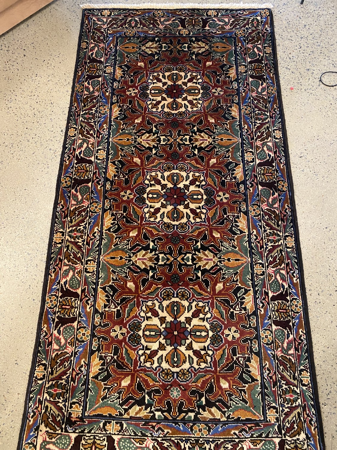 COLOURFUL TRIBAL PERSIAN SANGUN BALOUCH RUNNER, 100% WOOL. HAND-KNOTTED TRIBAL WEAVE; DESIGN OF REPEATING FLORAL MEDALLIONS SET WITHIN TRIBAL MOTIFS. BORDER OF TREE, POMEGRANATE AND TENDRILS. SIZE: 190 X 95 CM- ORIGIN: PERSIA – RRP: $950 CONDITION: EXCELLENT AND CLEAN. DOCUMENTATION OF AUTHENTICITY INCLUDED.