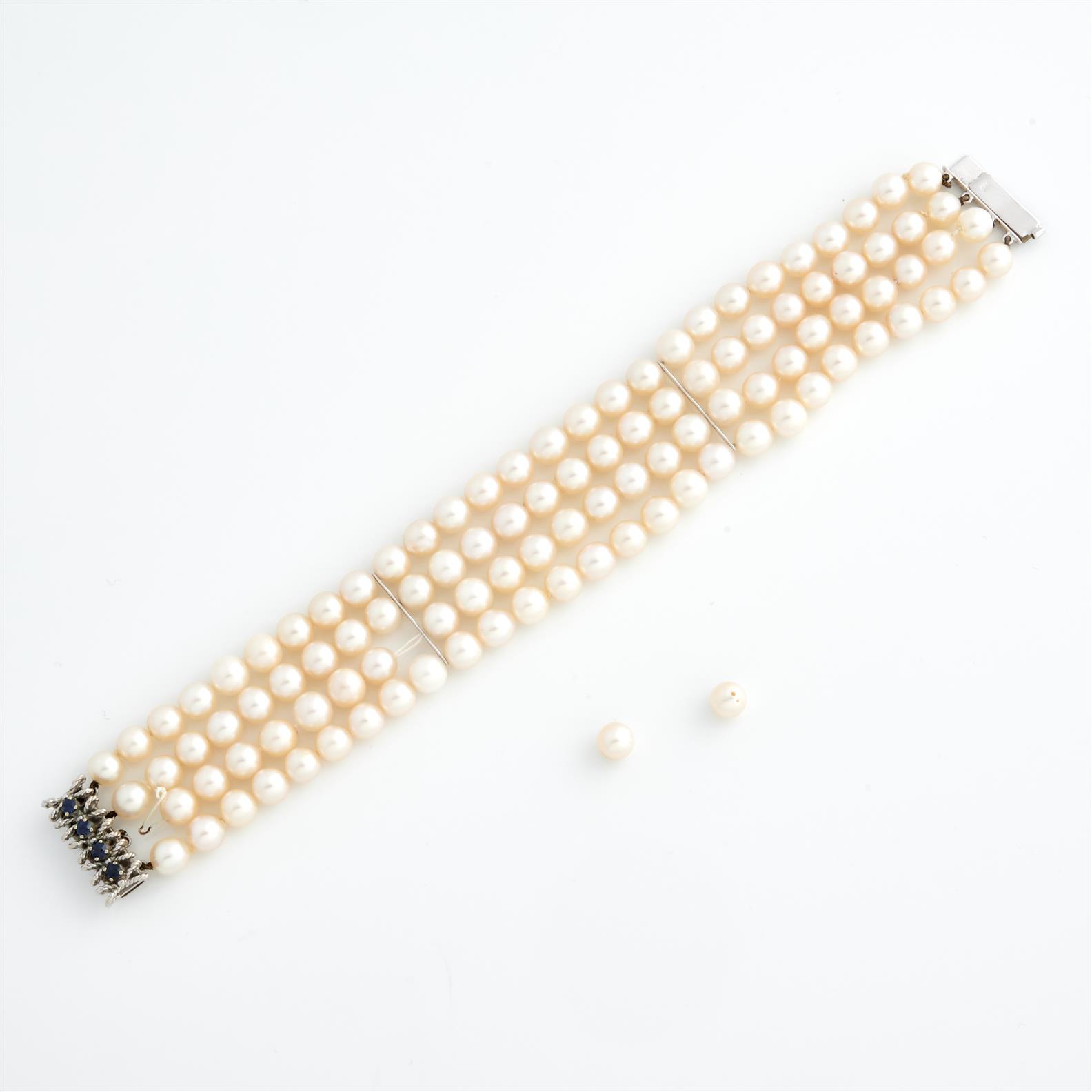 A MULTI STRAND PEARL BRACELET TO A SAPPHIRE SET CLASP IN 14CT WHITE GOLD, 220MM, A/F
