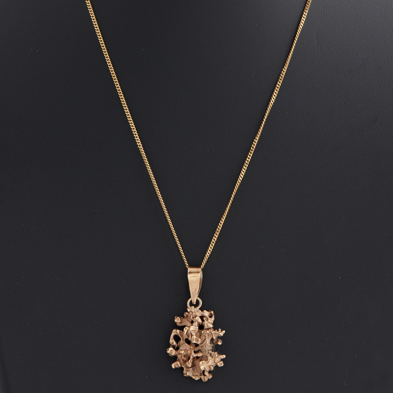 A FREE FORM PENDANT NECKLACE IN 9CT GOLD, PENDANT LENGTH 43MM, 9.9GMS