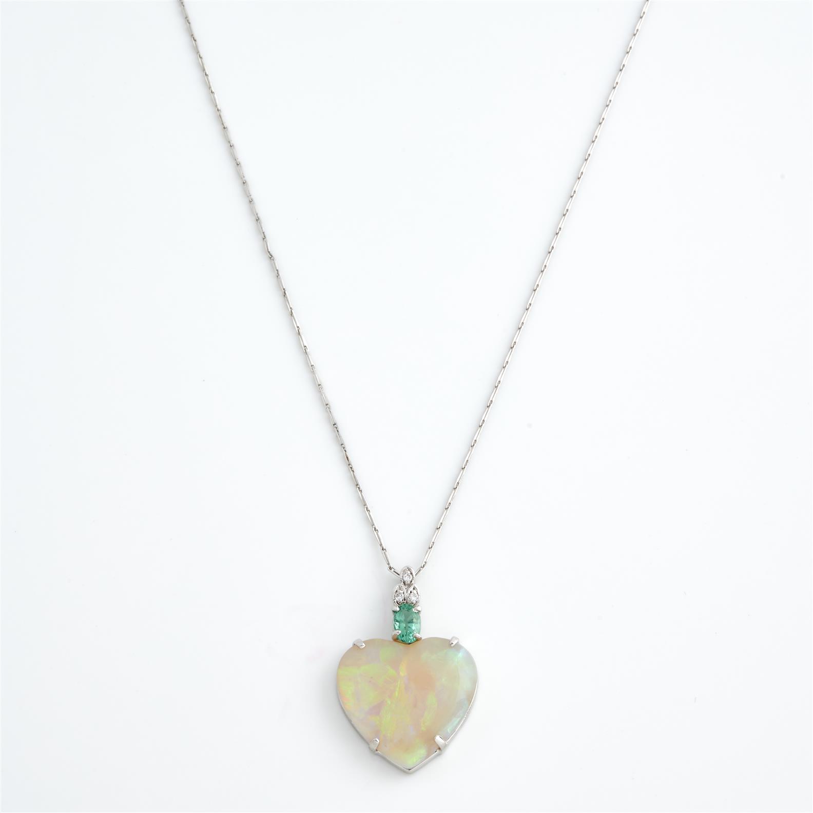 AN OPAL, EMERALD AND DIAMOND PENDANT IN 18CT WHITE GOLD, THE OPAL WEIGHING 10.25CT WITH EMERALDS TOTALLING 0.55CTS, 400MM, 6.3GMS