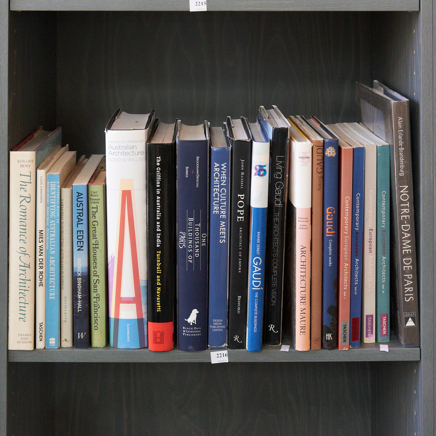 A SHELF OF ARCHITECTURE REFERENCE BOOKS INCLUDING GOAD & WILLIS 'THE ENCYCLOPEDIA OF AUSTRALIAN ARCHITECTURE', 'WHEN CULTURE MEETS ARCHITECTURE', 'THE GRIFFINS IN AUSTRALIA AND INDIA', AND 'LIVING GAUDI', LEONARD JOEL DELIVERY SIZE: LARGE