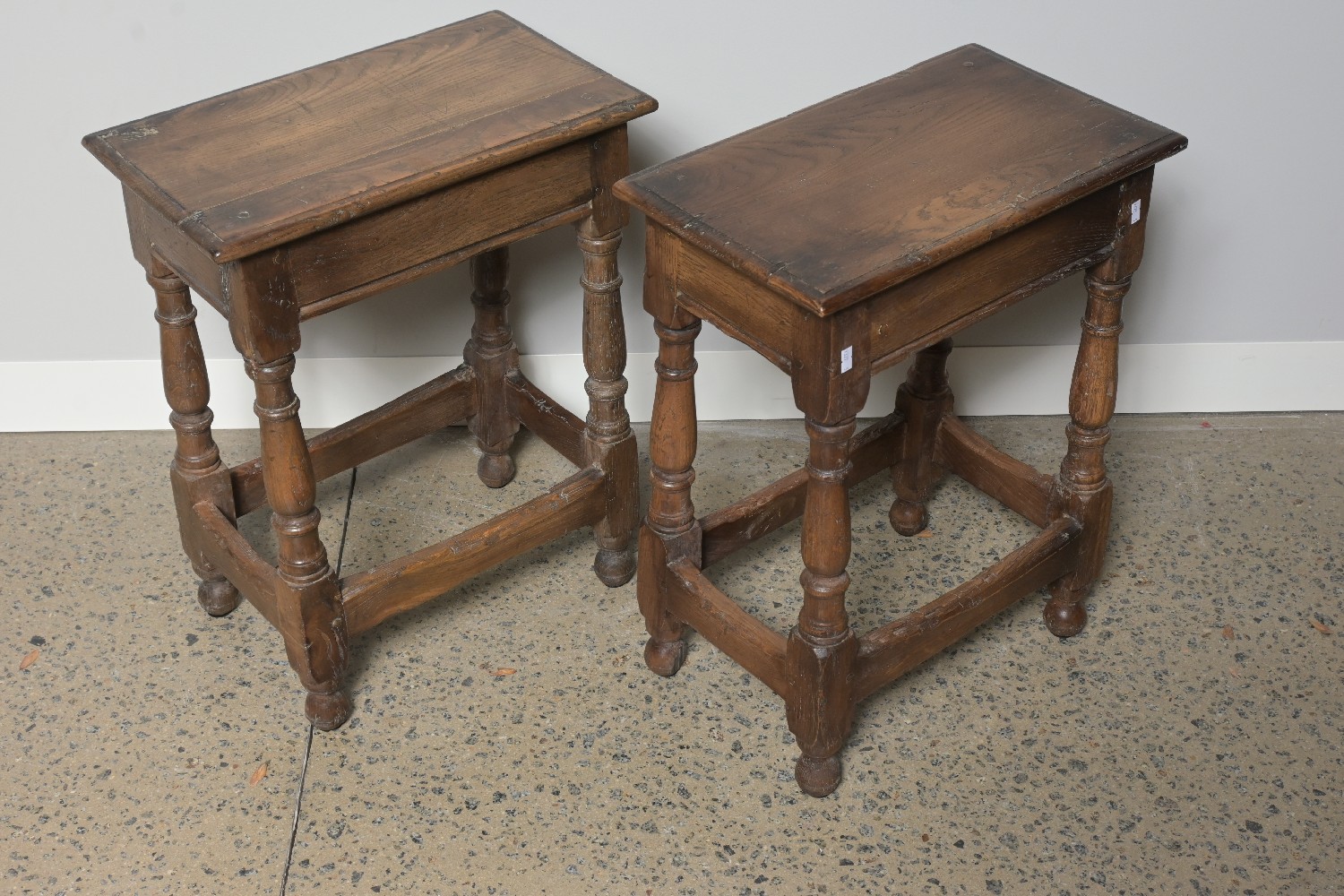 A PAIR OF CHARLES II STYLE OAK JOINT STOOLS (57H X 46W X 27D CM) (LEONARD JOEL DELIVERY: LARGE)