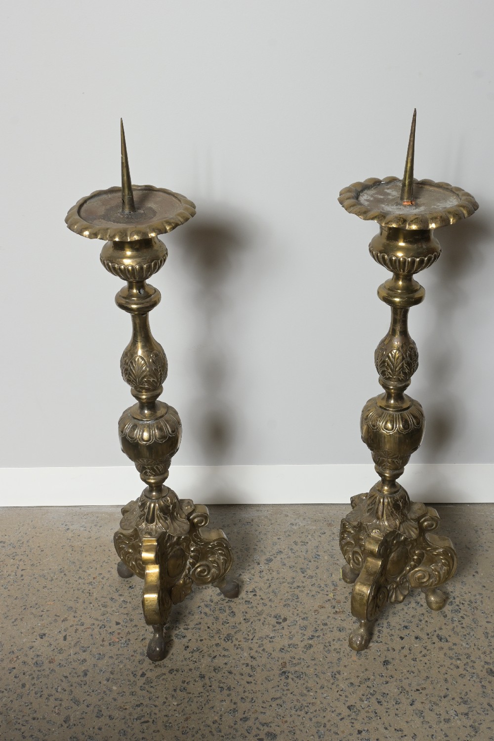 A PAIR OF PRESSED BRASS CANDLESTICKS (94H X 27DIA CM) (LEONARD JOEL DELIVERY: LARGE)