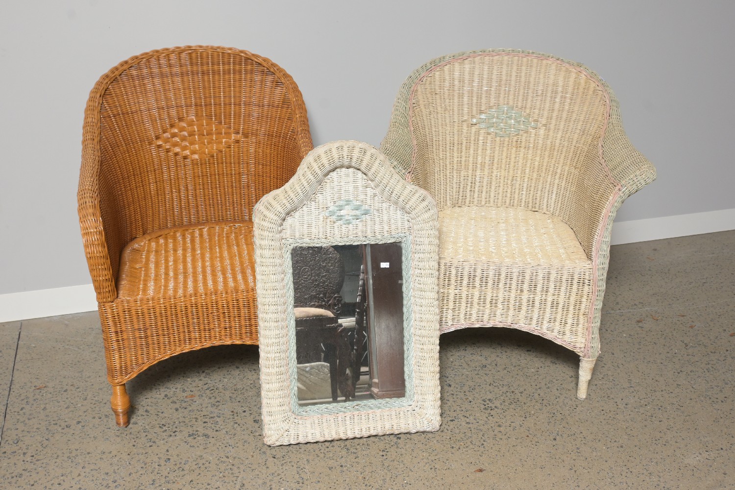 THREE PIECES OF VINTAGE CANE INCLUDING A PAIR OF FRENCH PAINTED CANE ARMCHAIR AND MATCHED MIRROR (H86 X W64 X D67) (LEONARD JOEL DELIVERY: X-LARGE)