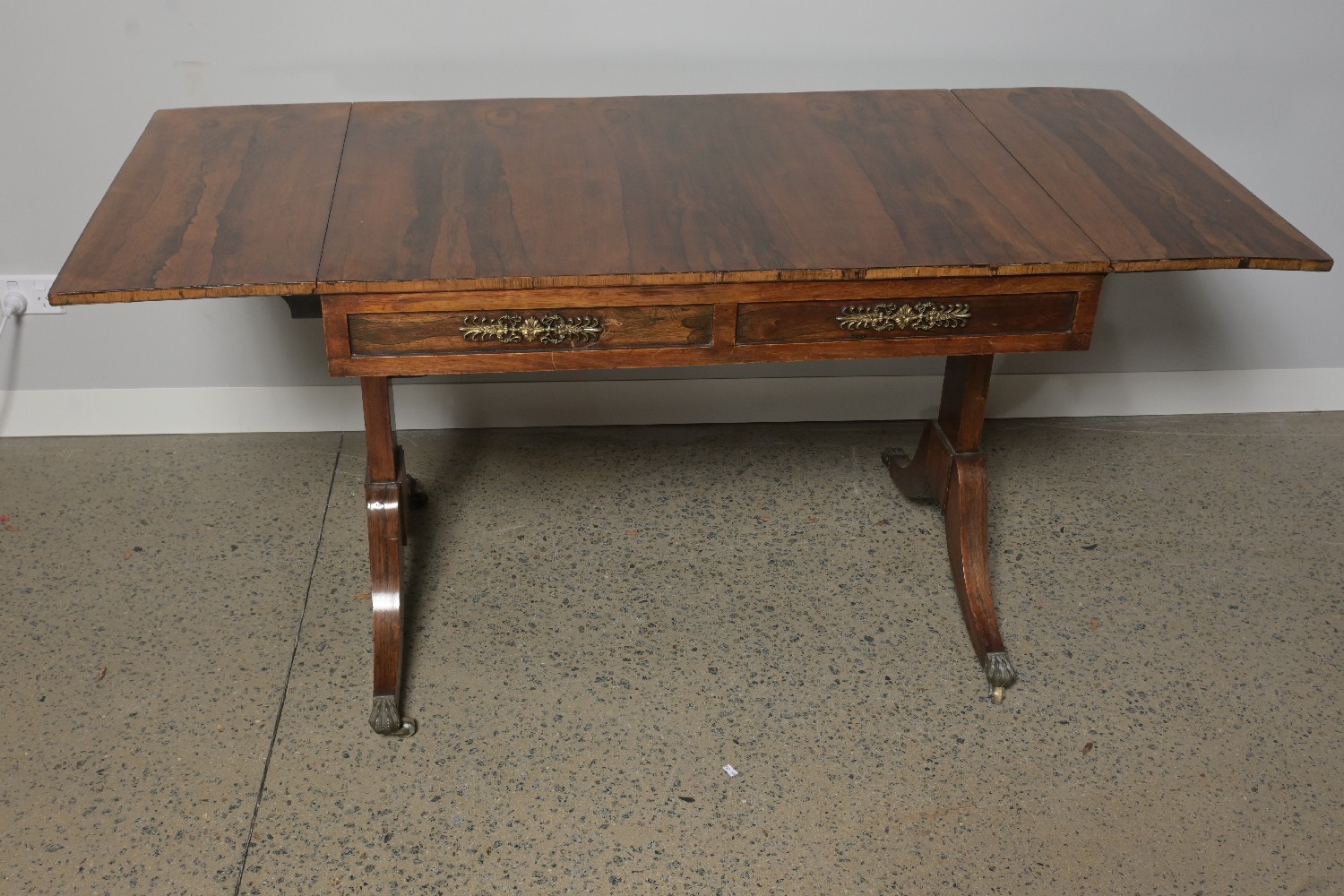 A ROSEWOOD AND BRASS TWO DRAWER SOFA TABLE WITH CASTORS (74H X 156W X 70D CM) (LEONARD JOEL DELIVERY: X-LARGE)