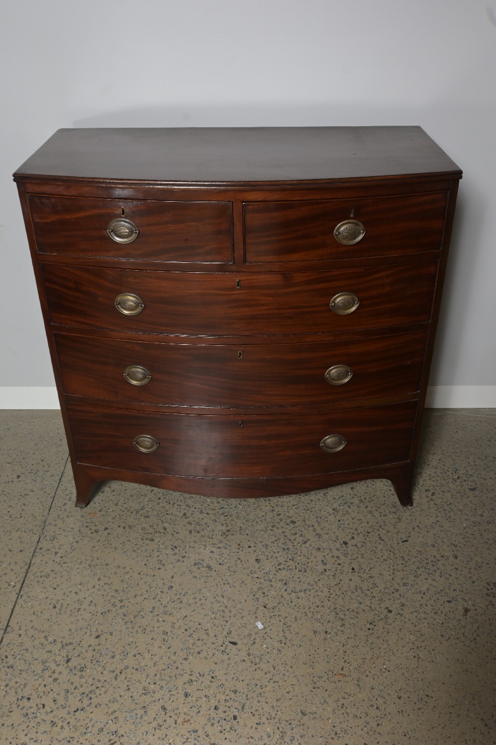 A GEORGIAN FIVE DRAWER CHEST OF DRAWERS WITH BRASS HANDLES AND BRASS ESCACHEONS (A/F) (104H X 105W X 53D CM) (PLEASE NOTE THIS HEAVY ITEM MUST BE REMOVED BY CARRIERS AT THE CUSTOMER'S EXPENSE. LEONARD JOEL STAFF CANNOT ASSIST CARRYING THIS ITEM) (X-LARGE)