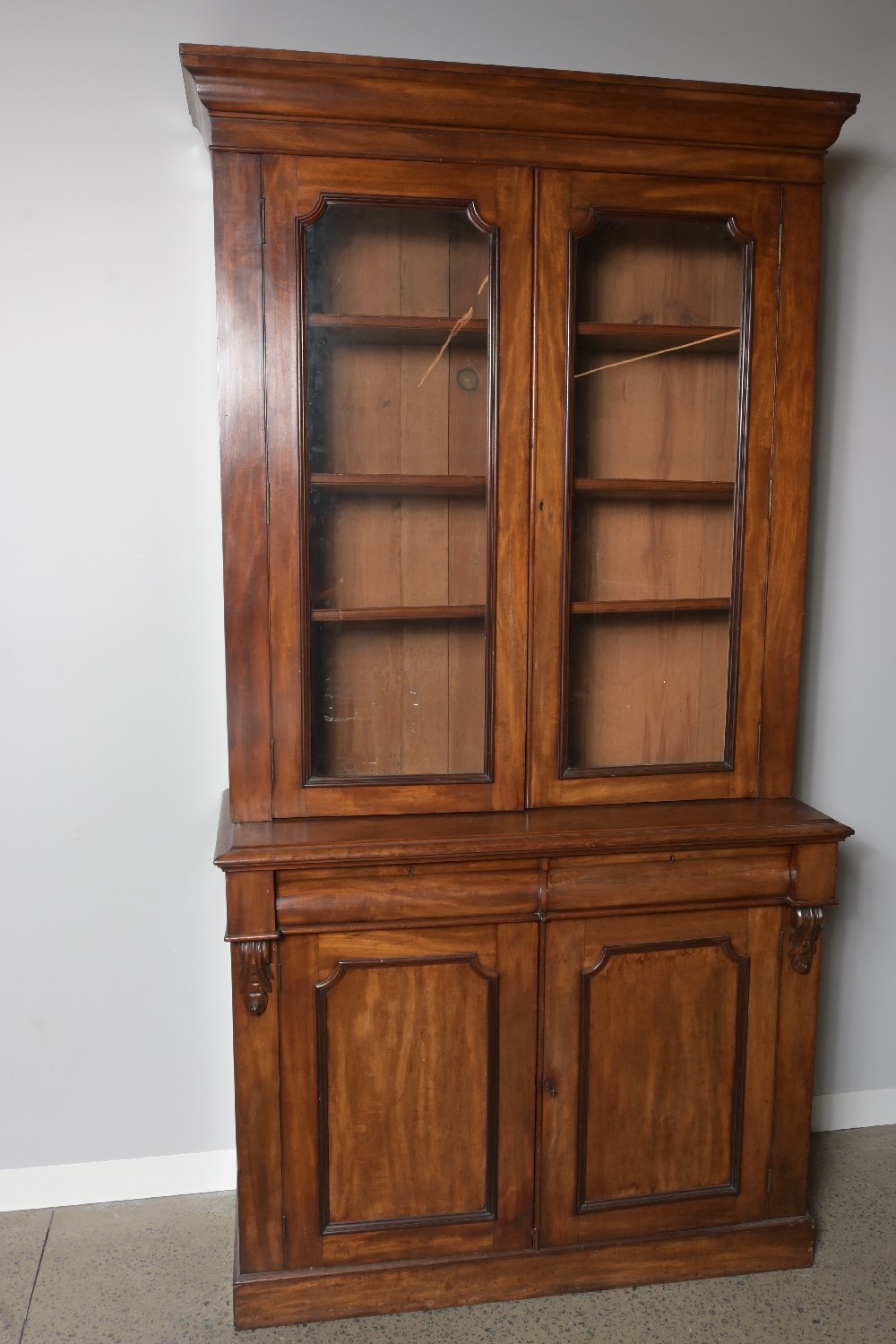 A CEDAR TWO-DOOR BOOKCASE (A/F) (235H X 122W X 50D CM) (PLEASE NOTE THIS HEAVY ITEM MUST BE REMOVED BY CARRIERS AT THE CUSTOMER'S EXPENSE. LEONARD JOEL STAFF CANNOT ASSIST CARRYING THIS ITEM) (X-LARGE)