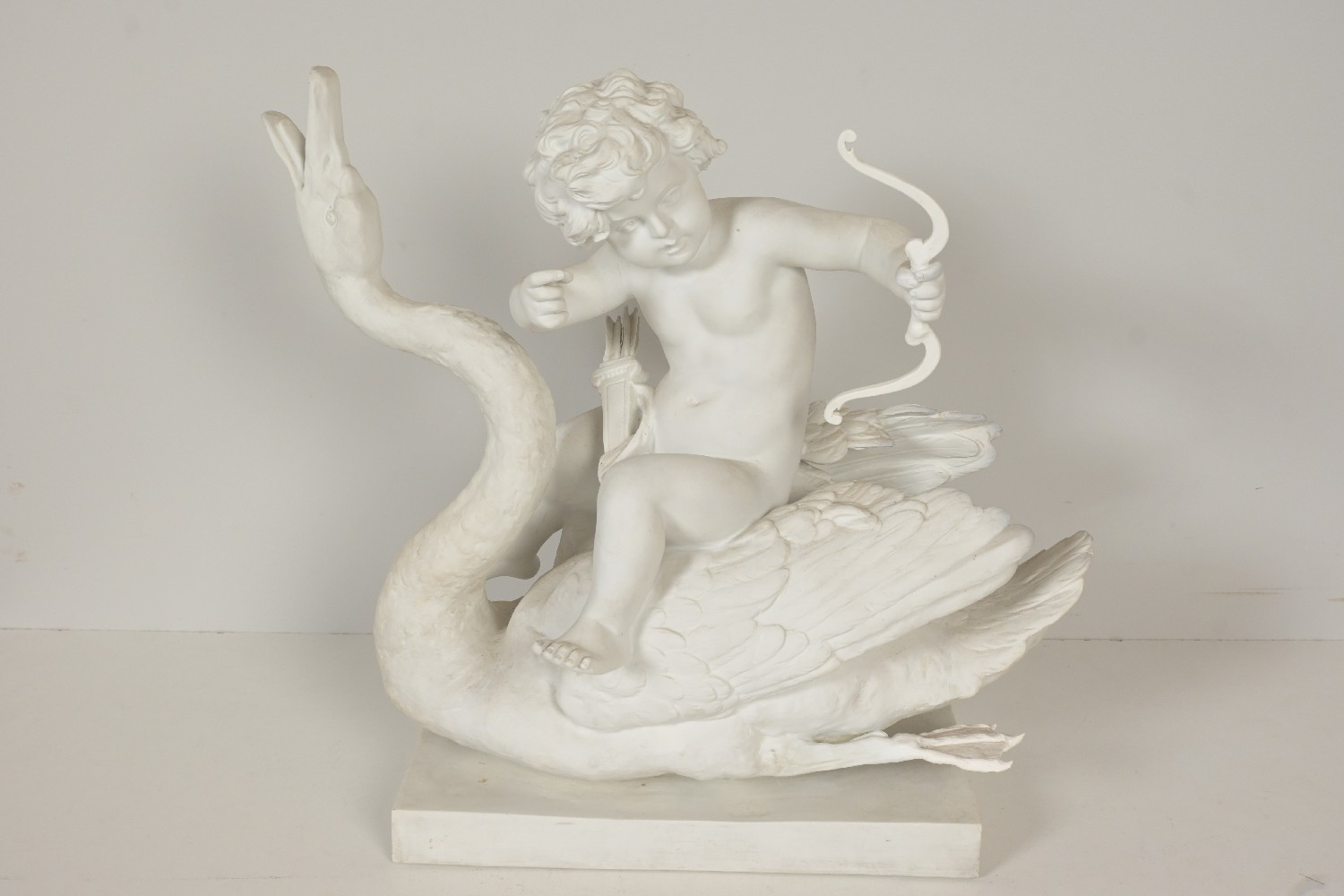 A PAINTED PLASTER FIGURE OF A CUPID ON SWAN, ILLEGIBLY SIGNED 50H X 50W X 25D (LEONARD JOEL DELIVERY: LARGE)