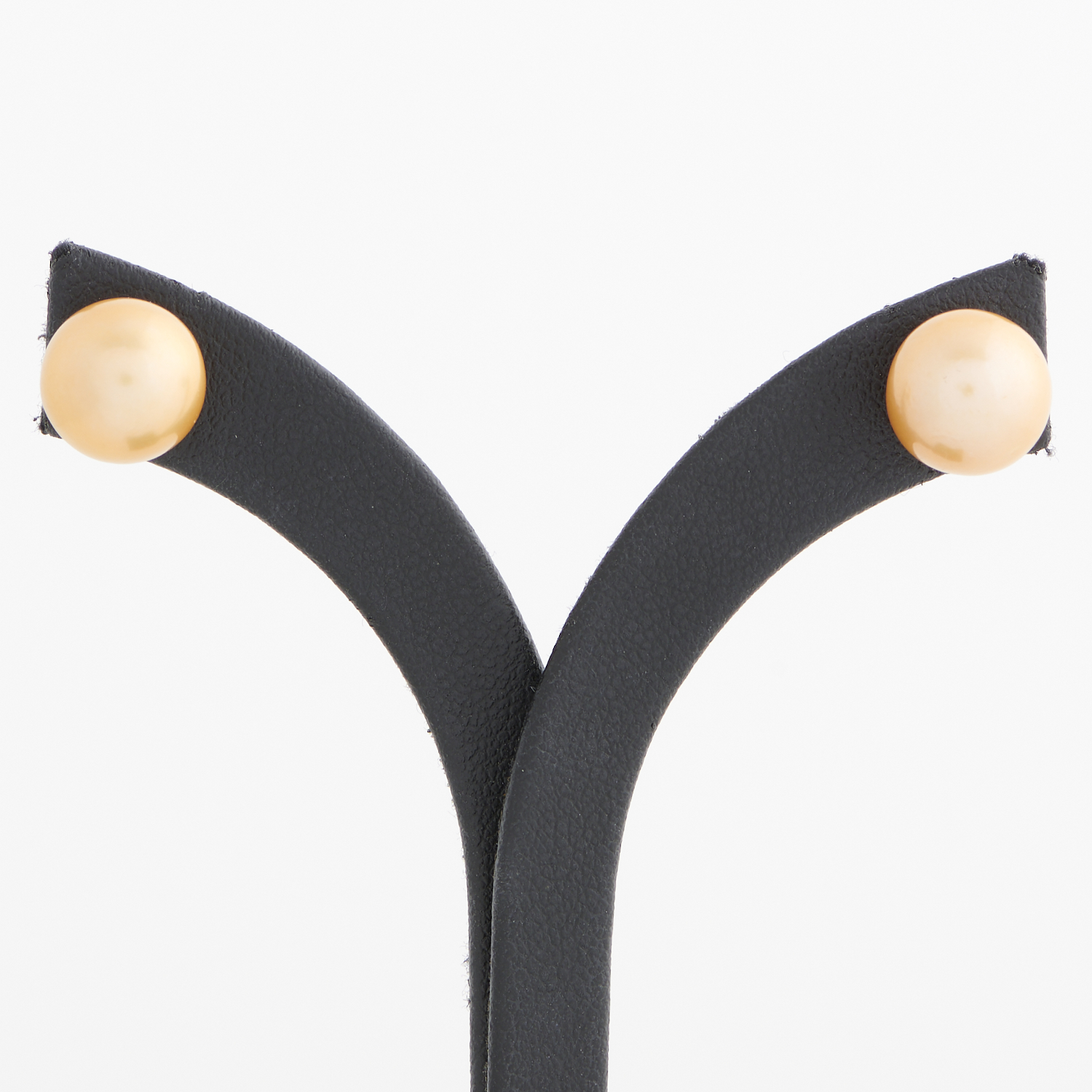 A PAIR OF GOLDEN SOUTH SEA PEARL EARRINGS TO POSTS IN 18CT GOLD, THE PEARLS MEASURING APPROXIMATELY 10MM