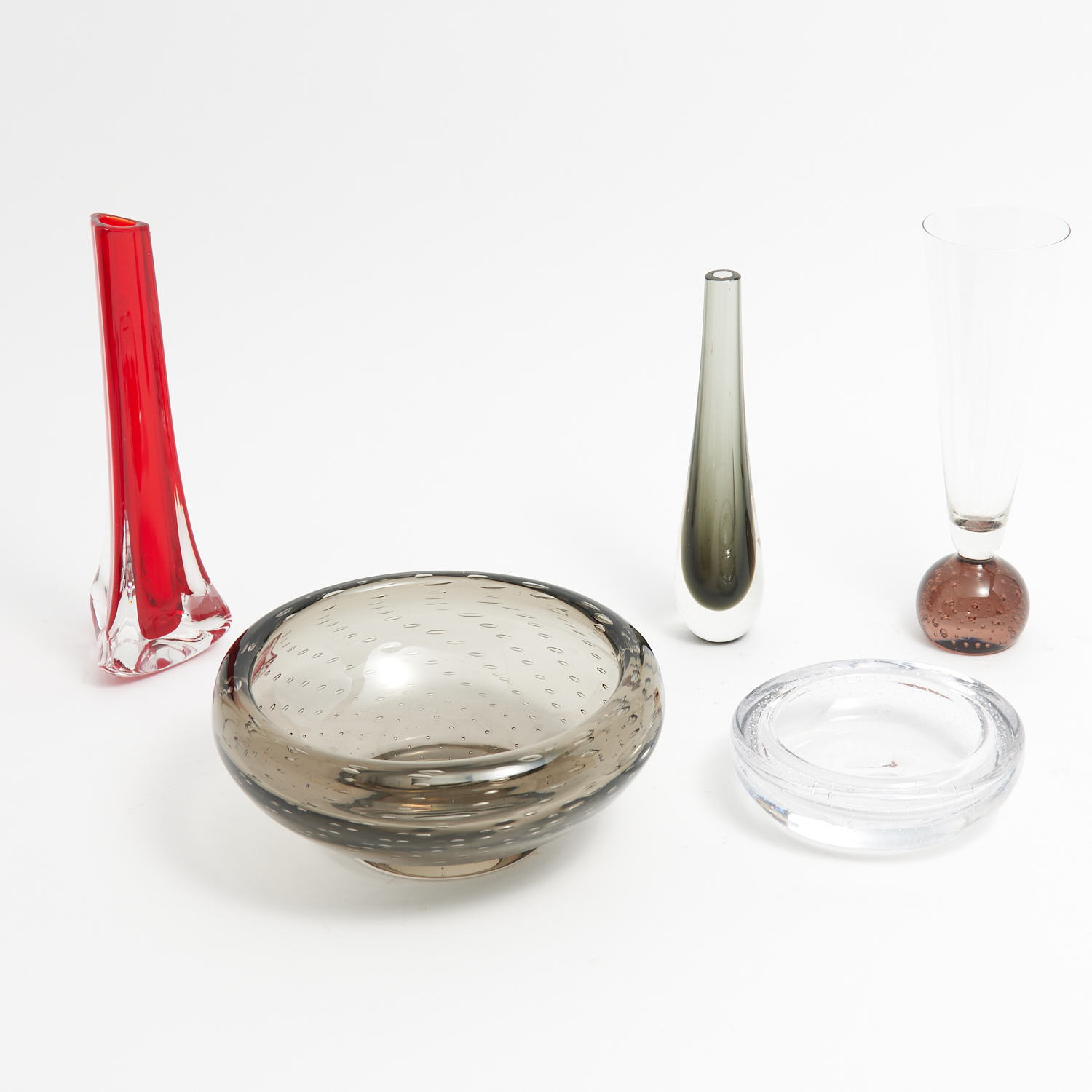 TWO GLASS BOWLS AND THREE VASES BY WHITEFRIARS H.24 CM (TALLEST), LEONARD JOEL DELIVERY SIZE: MEDIUM