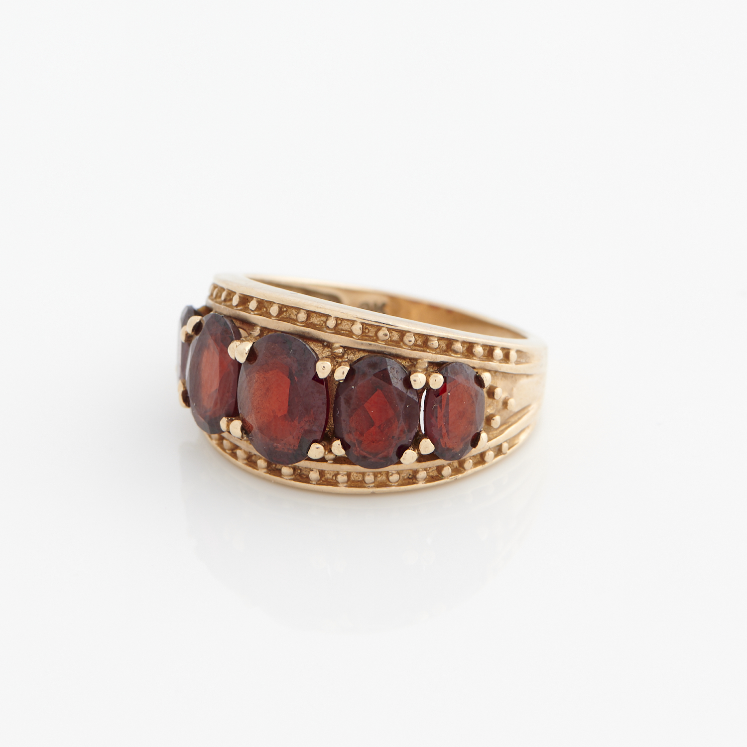 A GARNET FIVE STONE RING IN 9CT GOLD, SIZE N, 4.2GMS