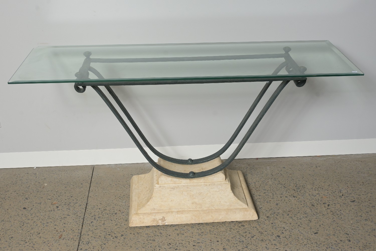 A FRENCH STYLE GLASS, METAL & STONE EFFECT CONSOLE TABLE(A/F) (76H X 141W X 45D CM) (PLEASE NOTE THIS HEAVY ITEM MUST BE REMOVED BY CARRIERS AT THE CUSTOMER'S EXPENSE. LEONARD JOEL STAFF CANNOT ASSIST CARRYING THIS ITEM) (X-LARGE)