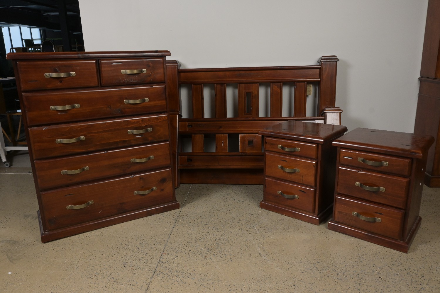 A HARDWOOD BEDROOM SUITE WITH BRASS DETAILS COMPRISING PAIR OF BEDSIDES, BEDHEADS AND CHEST OF DRAWERS (A/F) 128H X 105W X 47D (CHEST OF DRAWERS) (PLEASE NOTE THIS HEAVY ITEM MUST BE REMOVED BY CARRIERS AT THE CUSTOMER'S EXPENSE. LEONARD JOEL STAFF CANNOT ASSIST CARRYING THIS ITEM) (X-LARGE)