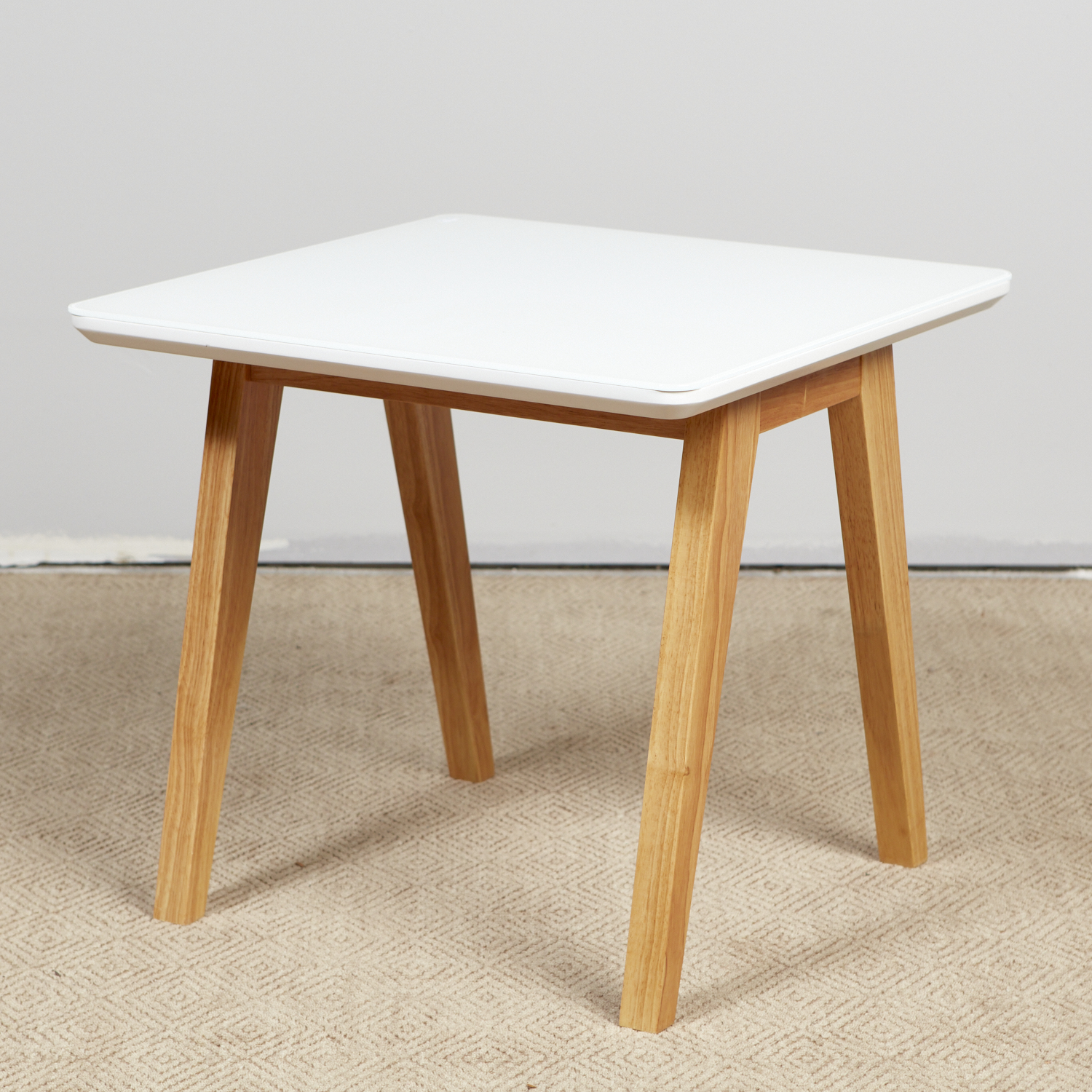 A SIDE TABLE WITH A TEMPERED GLASS TOP ON A WOOD BASE (55H X 61W X 61D CM) (LEONARD JOEL DELIVERY: LARGE)