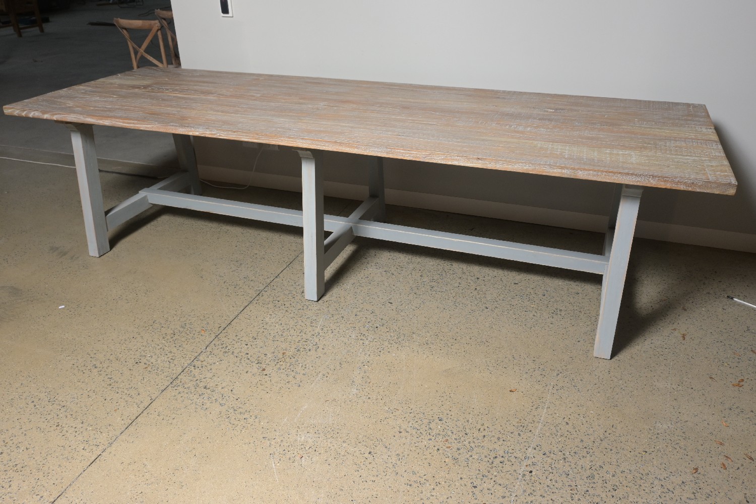 AN ELM STRETCHER AND TRESSLE BASE DINING TABLE (77H X 300W X 100D CM) (PLEASE NOTE THIS HEAVY ITEM MUST BE REMOVED BY CARRIERS AT THE CUSTOMER'S EXPENSE. LEONARD JOEL STAFF CANNOT ASSIST CARRYING THIS ITEM) (X-LARGE)