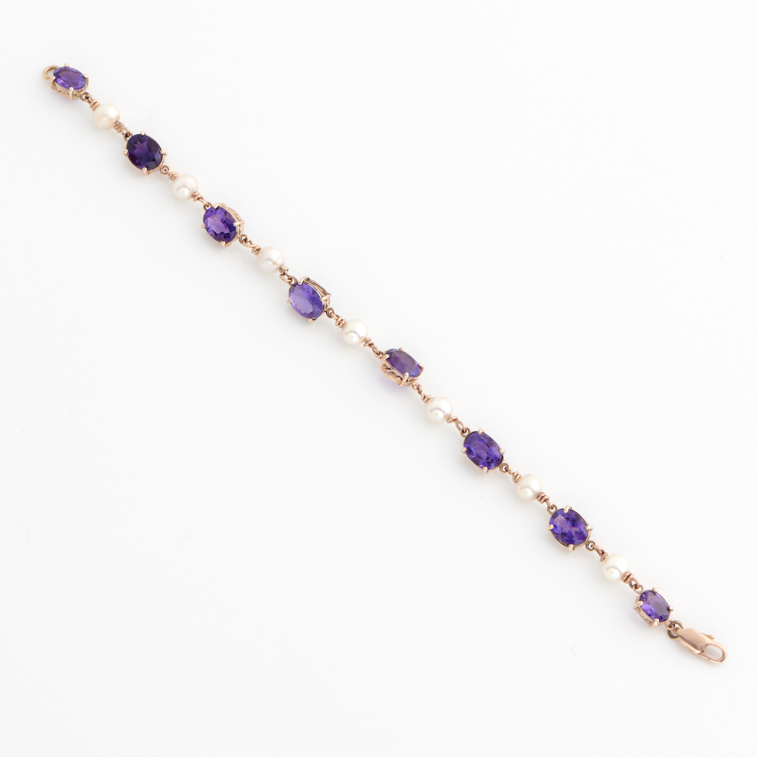 AN AMETHYST AND CULTURED PEARL BRACELET IN 9CT GOLD, LENGTH 185MM