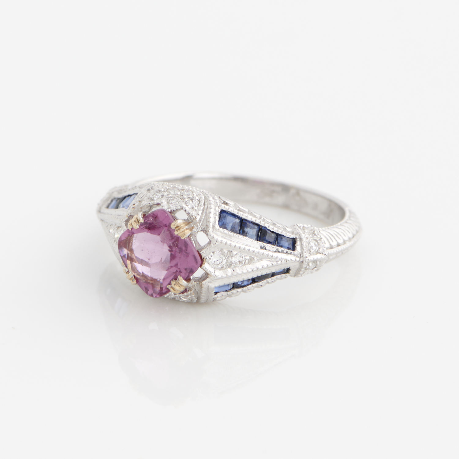 A TOURMALINE, SAPPHIRE AND DIAMOND RING IN 18CT WHITE GOLD, THE TOURMALINE WEIGHING APPROXIMATELY 0.95CTS WITH SAPPHIRE TOTALLING 0.60CTS, SIZE N, 4.1GMS