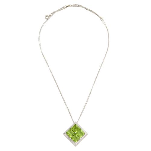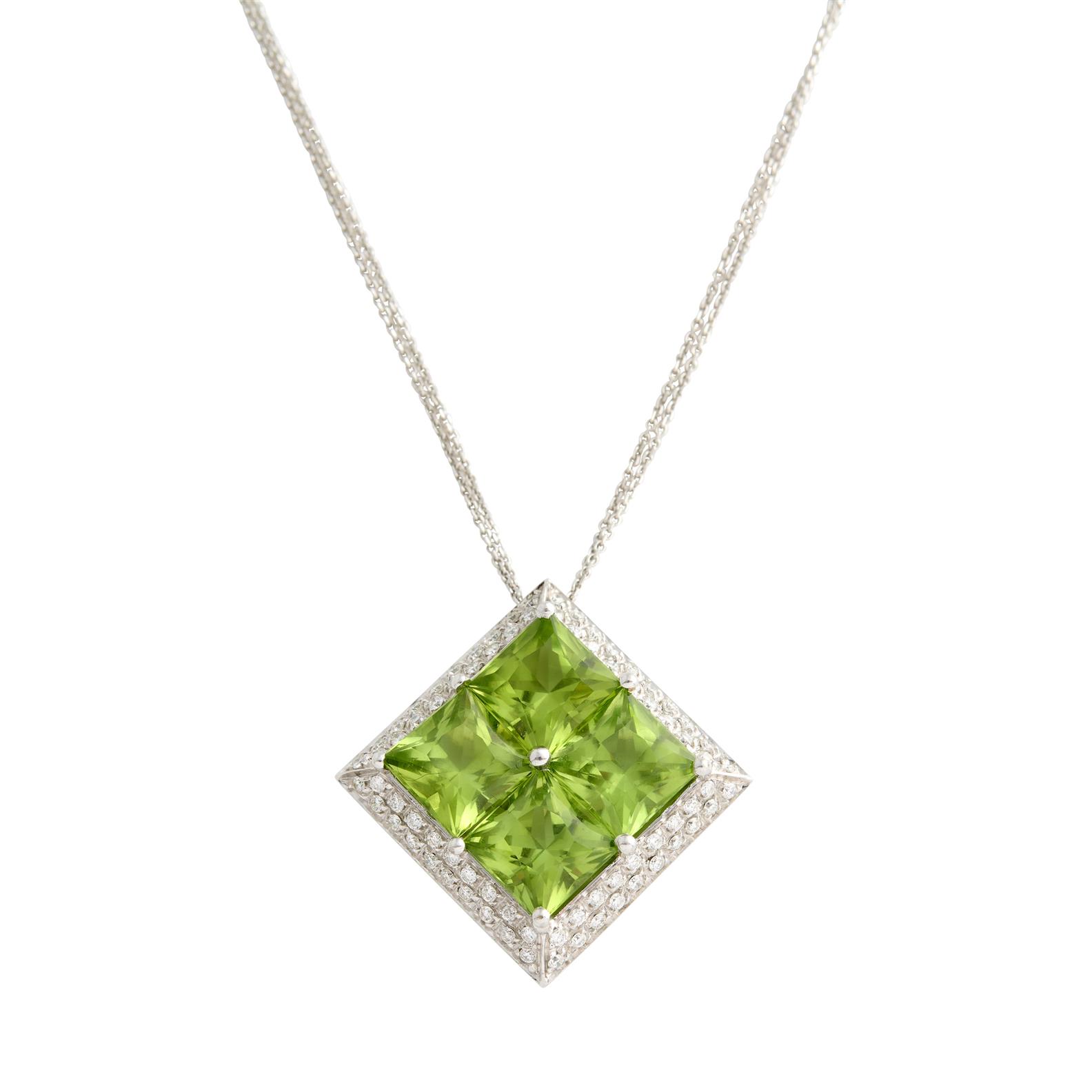Of cluster design, centring four square-cut periods, framed by a double halo of pavé-set brilliant-cut diamonds, suspended by a double trace chain, the diamonds together weighing approximately 0.75 carats, mounted in 18ct white gold, pendant length 30mm, inner circumference 420mm, gross weight approximately 15 grams.
