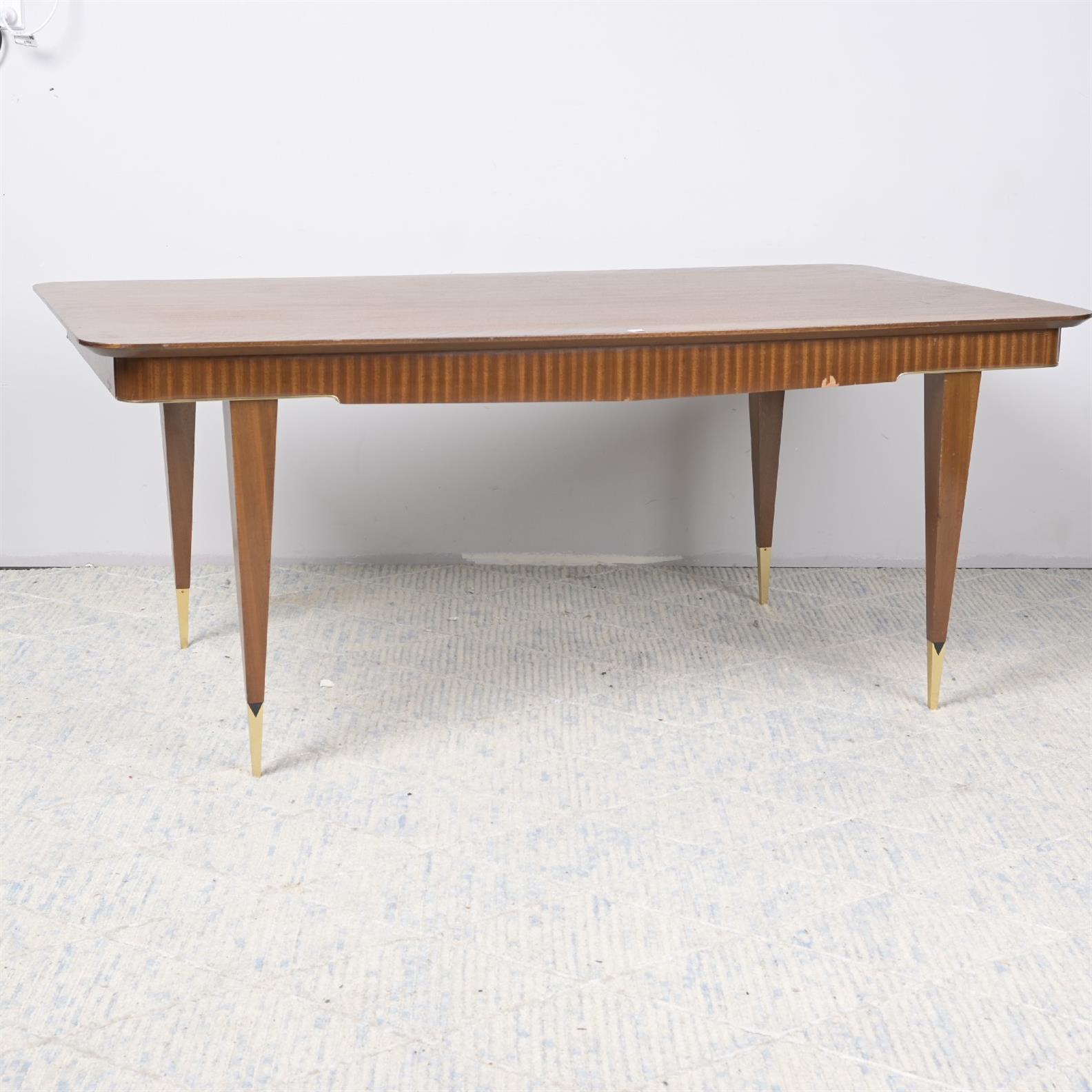 A MID-CENTURY DINING TABLE WITH CROSS BANDING TO TOP AND BRASS ACCENTS (A/F) 76H X 181W X 101D (PLEASE NOTE THIS HEAVY ITEM MUST BE REMOVED BY CARRIERS AT THE CUSTOMER'S EXPENSE. LEONARD JOEL STAFF CANNOT ASSIST CARRYING THIS ITEM) (X-LARGE)