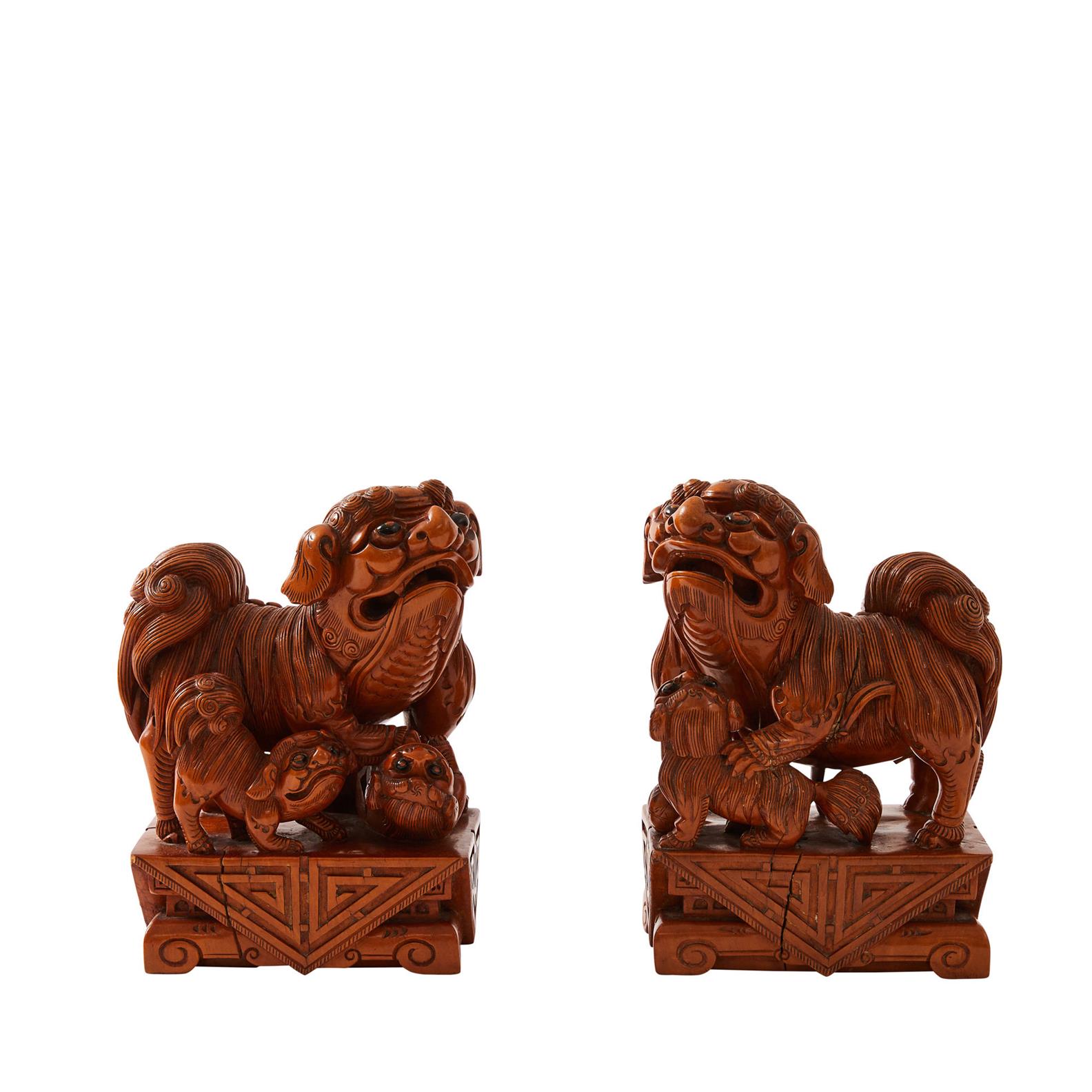 Each on a geometrically carved plinth with blind fretwork lappets and scroll feet.