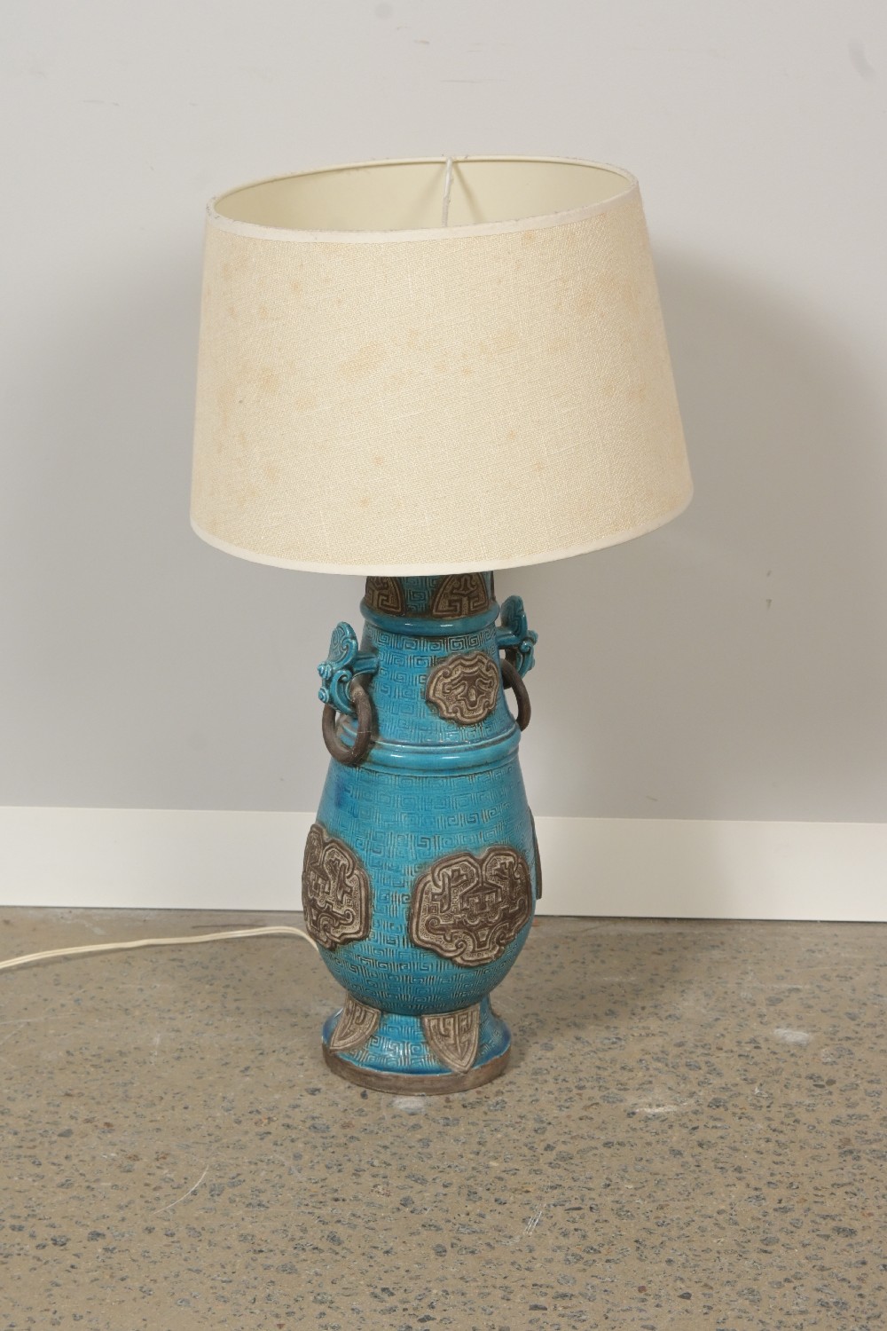AN ITALIAN BLUE CERAMIC TABLE LAMP (75H X 41DIA CM) (LEONARD JOEL DELIVERY: LARGE)