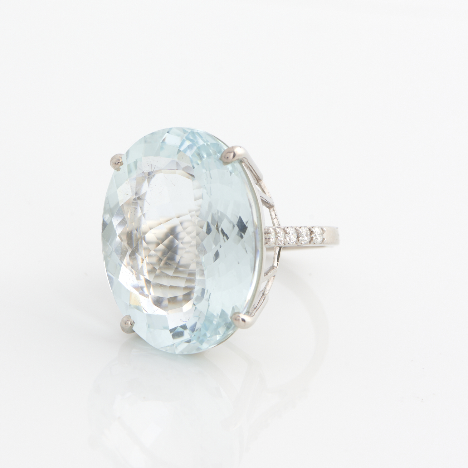 AN AQUAMARINE AND DIAMOND RING IN 18CT WHITE GOLD, THE AQUAMARINE OF APPROXIMATELY 23.00CTS, SIZE N