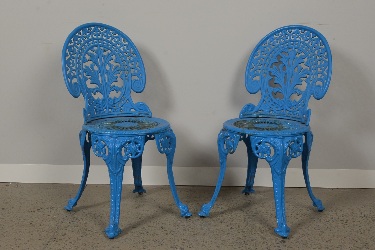 A PAIR OF BLUE CAST IRON GARDEN SEATS (A/F) (83H X 42W X 49D CM) (LEONARD JOEL DELIVERY: LARGE)