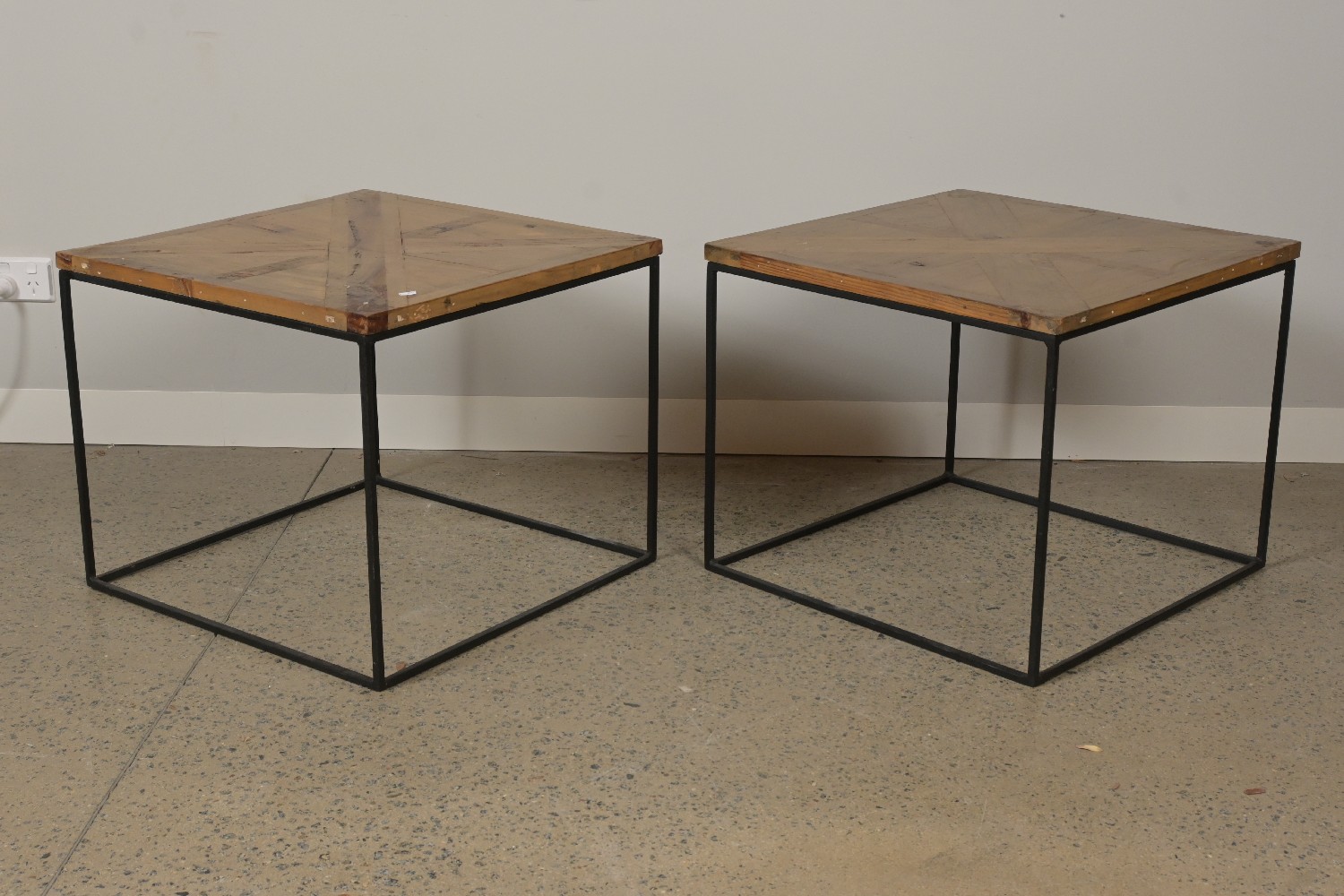 A PAIR OF PARQUETRY TOP SIDE TABLES (A/F) 50H X 61W X 61D (LEONARD JOEL DELIVERY: X-LARGE)