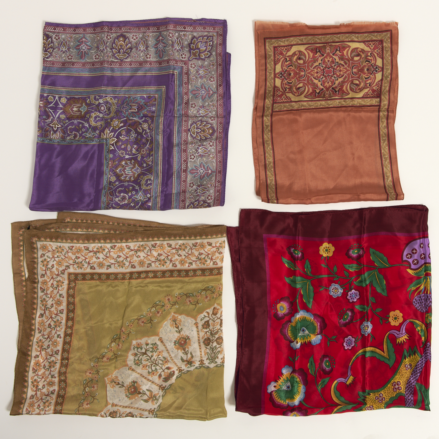 OSCAR DE LA RENTA, A COLLECTION OF FOUR SCARVES STYLED IN PATTERNED SILK, ONE SCARF MEASURING 150 X 28CM, THE OTHERS MEASURING 77CM SQUARED