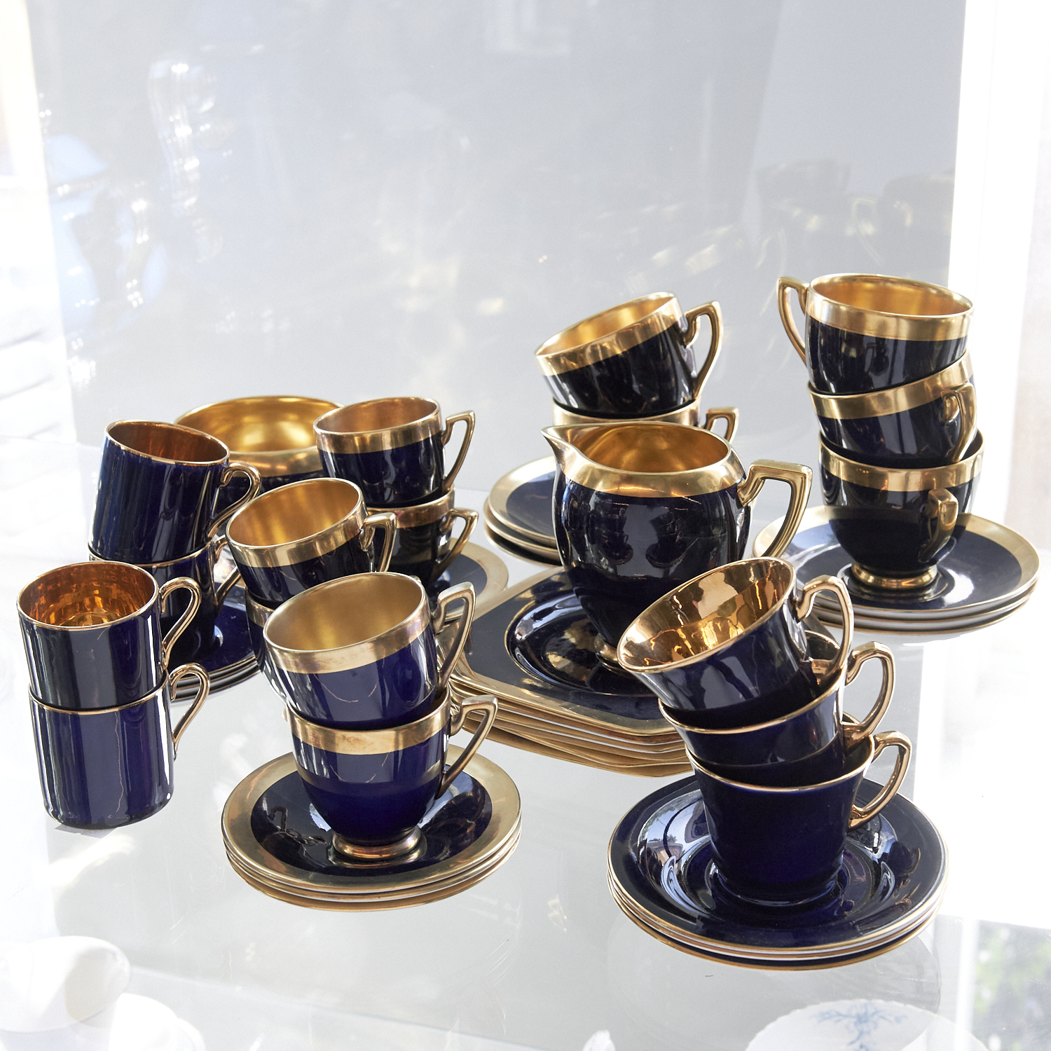 A PART ENGLISH BARONESS PATTERN TEA SERVICE WITH GILDING ON DEEP NAVY BLUE TOGETHER WITH A SIMILAR PART CROWN DEVON SERVICE H.10CM (TALLEST), LEONARD JOEL DELIVERY SIZE: LARGE