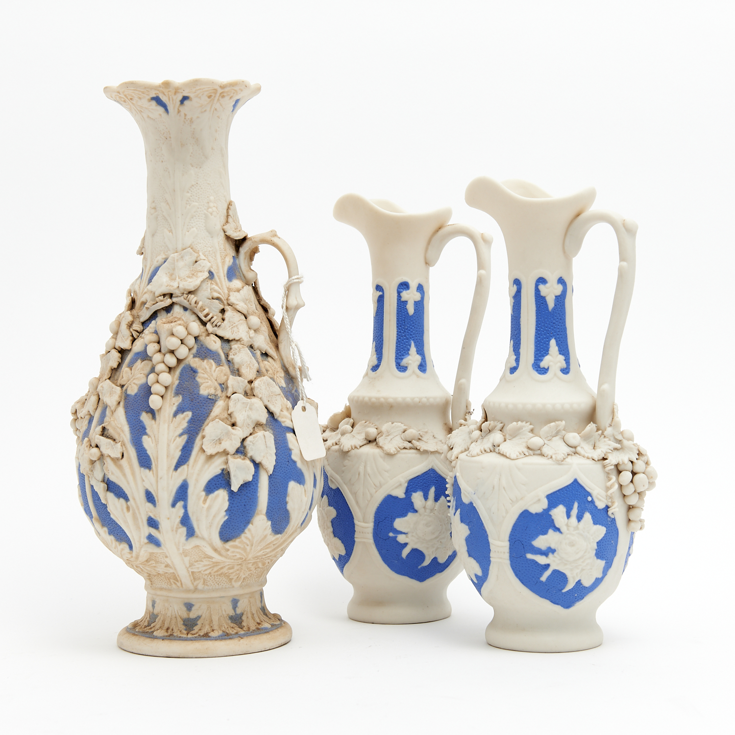 A PAIR OF SALT GLAZE PITCHERS AND A SALT GLAZE VASE H.29CM (TALLEST), LEONARD JOEL DELIVERY SIZE: MEDIUM