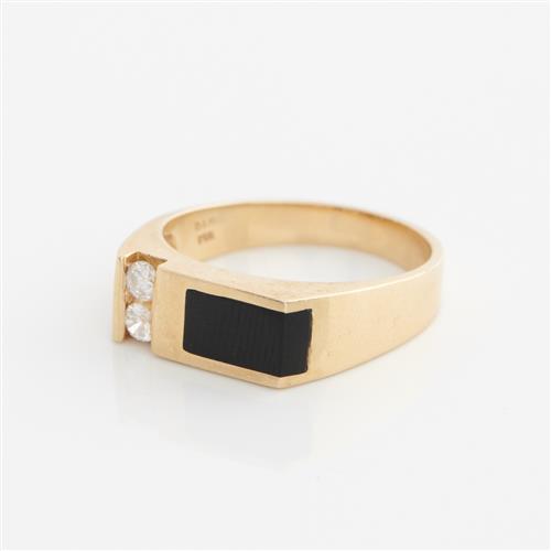 AN ONYX AND DIAMOND BAND RING IN 14CT GOLD, SIZE R, 6.3GMS