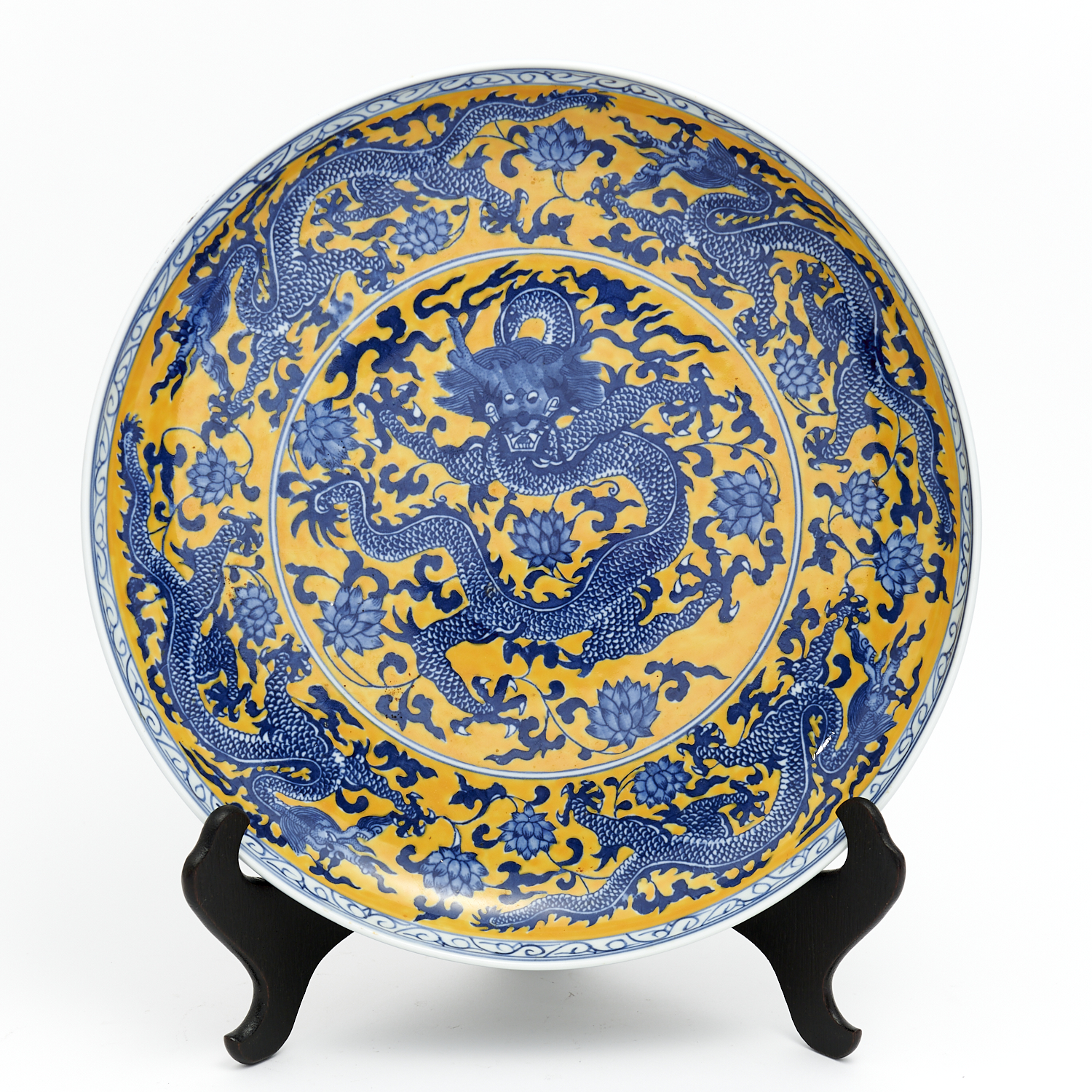 A CHINESE IMPERIAL YELLOW GROUND PORCELAIN CHARGER DIA.37CM, LEONARD JOEL DELIVERY SIZE: LARGE