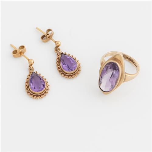 AN AMETHYST RING IN 9CT GOLD, SIZE J, TOGETHER WITH A PAIR OF EARRINGS IN 9CT GOLD TO POST AND BUTTERFLY FITTINGS, 6.9GMS