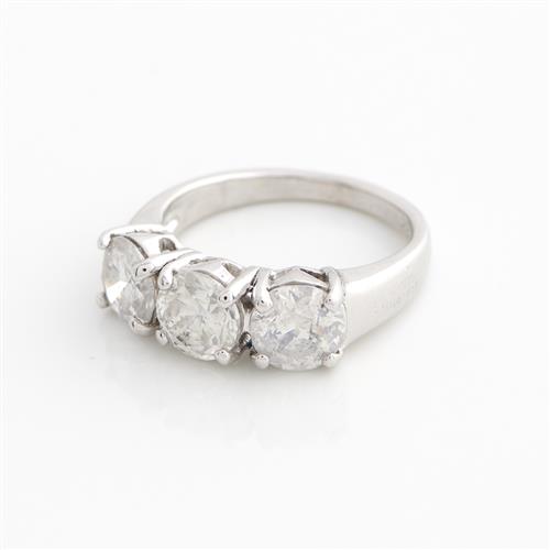 A THREE STONES DIAMOND RING IN 18CT GOLD, THE DIAMONDS TOTALLING 3.02CT, F-G, P1, WITH A VALUATION