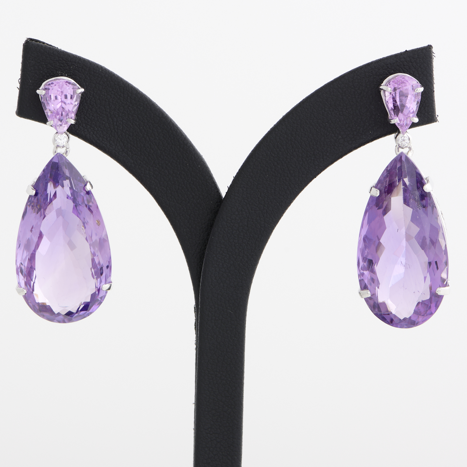 A PAIR OF AMETHYST, KUNZITE AND DIAMOND EARRINGS IN 18CT WHITE GOLD , THE AMETHYSTS TOTALLING 65.10CT, THE KUNZITES TOTALLING 5.12CTS, TO POST AND BUTTERFLY FITTINGS, 43MM