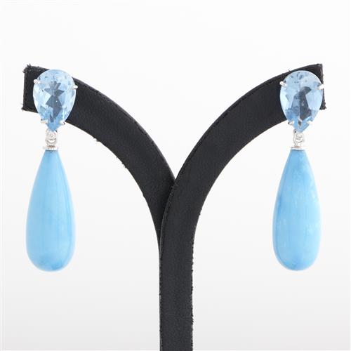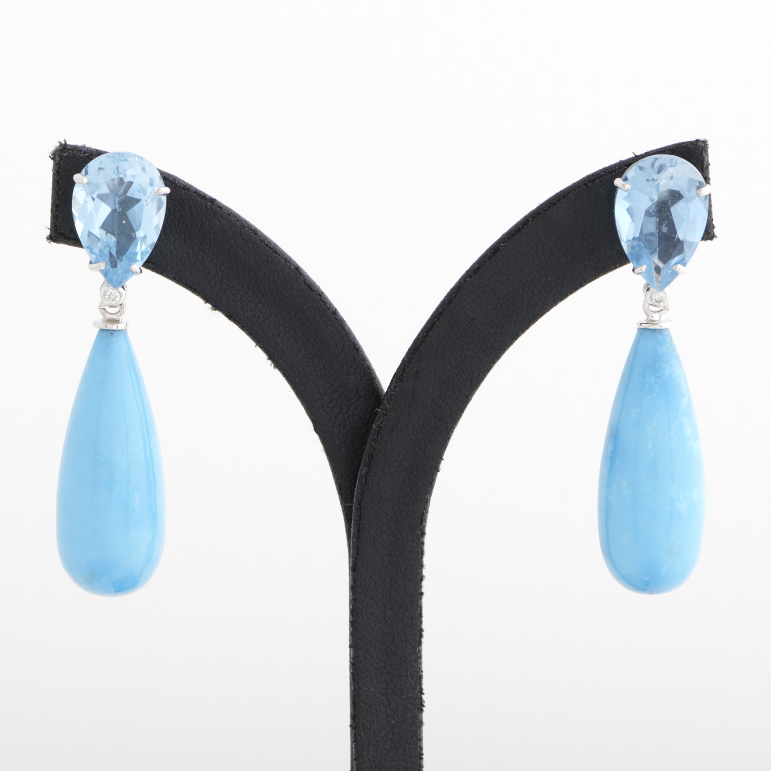 A PAIR OF TOPAZ, TURQUOISE AND DIAMOND EARRINGS IN 18CT WHITE GOLD, THE TOPAZ WEIGHING 14.20CT, TO POST AND BUTTERFLY FITTINGS, LENGTH 45MM