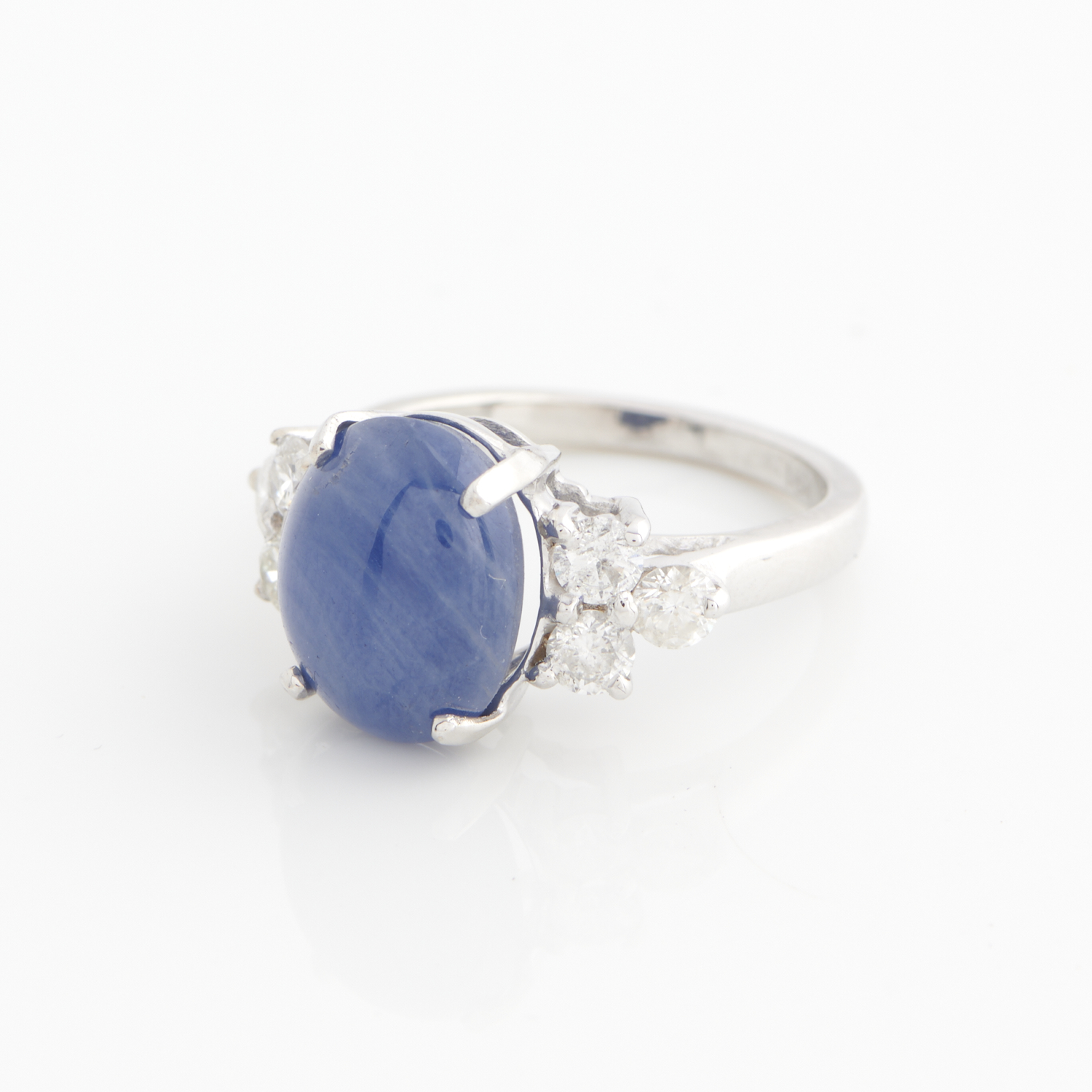 AN UNHEATED STAR SAPPHIRE RING IN 18CT WHITE GOLD, THE SAPPHIRE WEIGHING 6.95CTS, THE DIAMONDS TOTALLING 0.68CT, SIZE M