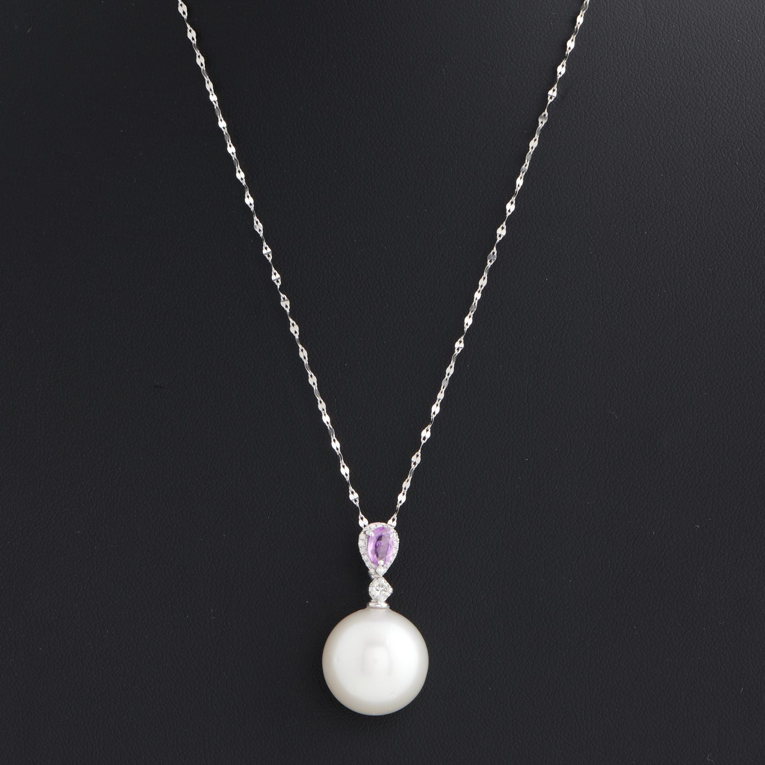 A SOUTH SEA PEARL AND PINK SAPPHIRE PENDANT IN 18CT WHITE GOLD, THE SOUTH SEA PEARL OF 16.5MM WITH THE PINK SAPPHIRE 0.30CTS AND DIAMONDS TOTALLING 0.20CTS, TO A CONFORMING FANCY LINK CHAIN, 440MM