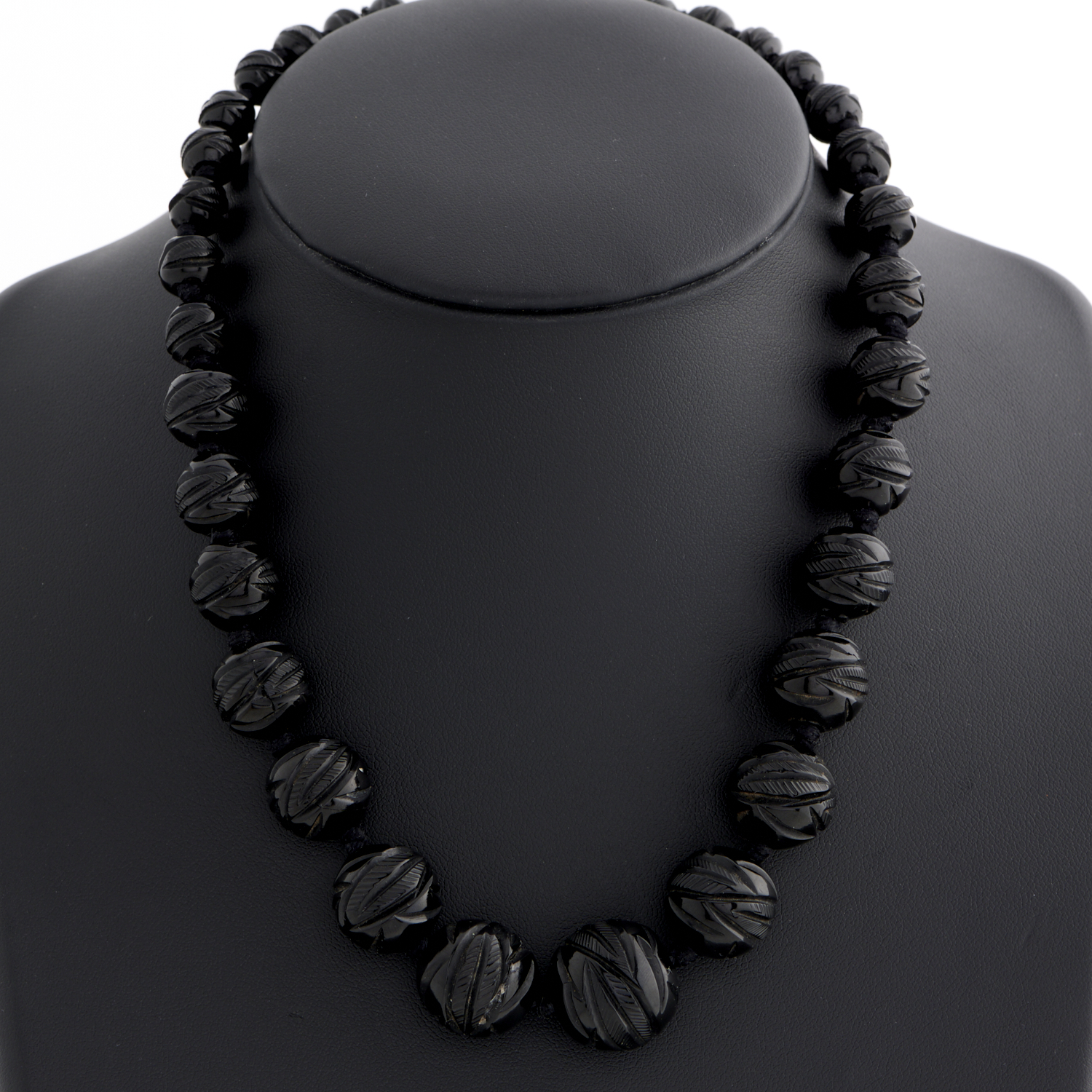 A STRAND OF VICTORIAN CARVED JET BEADS TO AN OVAL CLASP, CIRCA 1880, LENGTH 440MM
