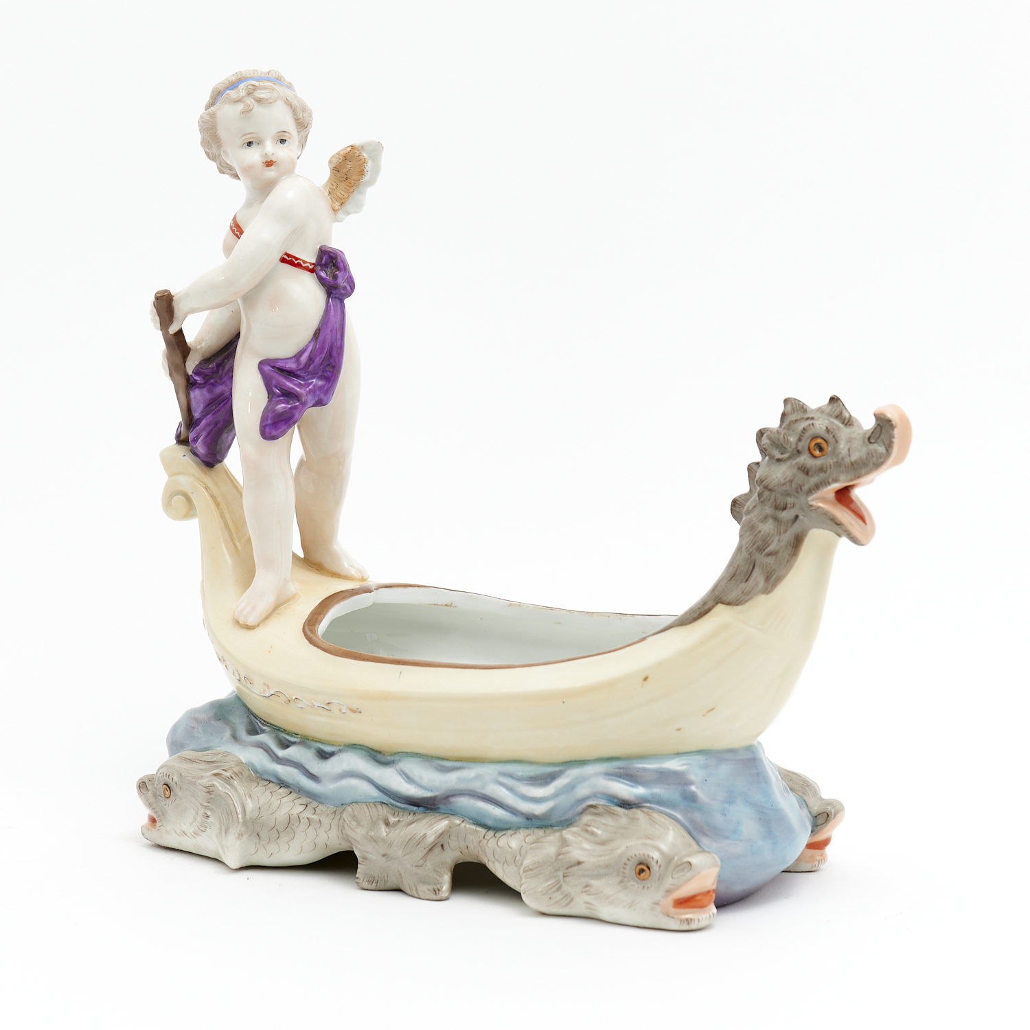 A GERMAN PORCELAIN BOAT FORMED VASE WITH PUTTI L.26.5CM, LEONARD JOEL DELIVERY SIZE: SMALL