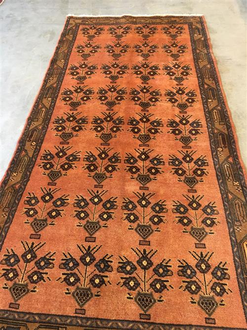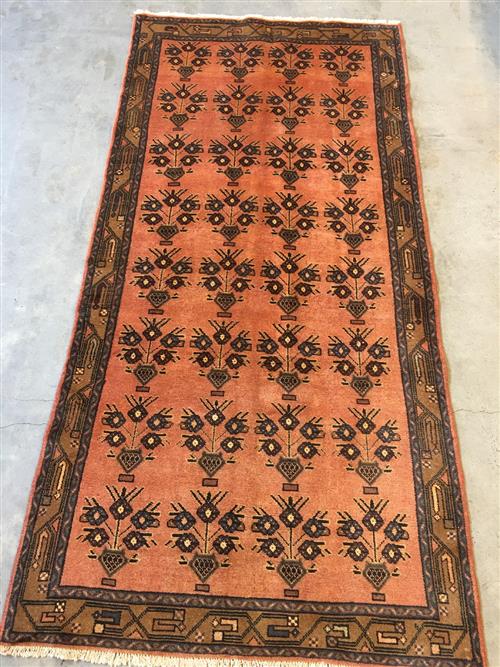 PERSIAN TRIBAL TAROOM RUG. 100% WOOL ; VEGETABLE ORGANIC DYES, ALL OVER VASE DESIGN ON A SOFT RED FIELD. BORDER OF TRIBAL MOTIFS. SIZE: 286 X 14O CM - ORIGIN: PERSIA – RRP: $1,600 CONDITION: GOOD CLEAN CONDITION, SEMI VINTAGE PILE. DOCUMENTATION OF AUTHENTICITY INCLUDED.