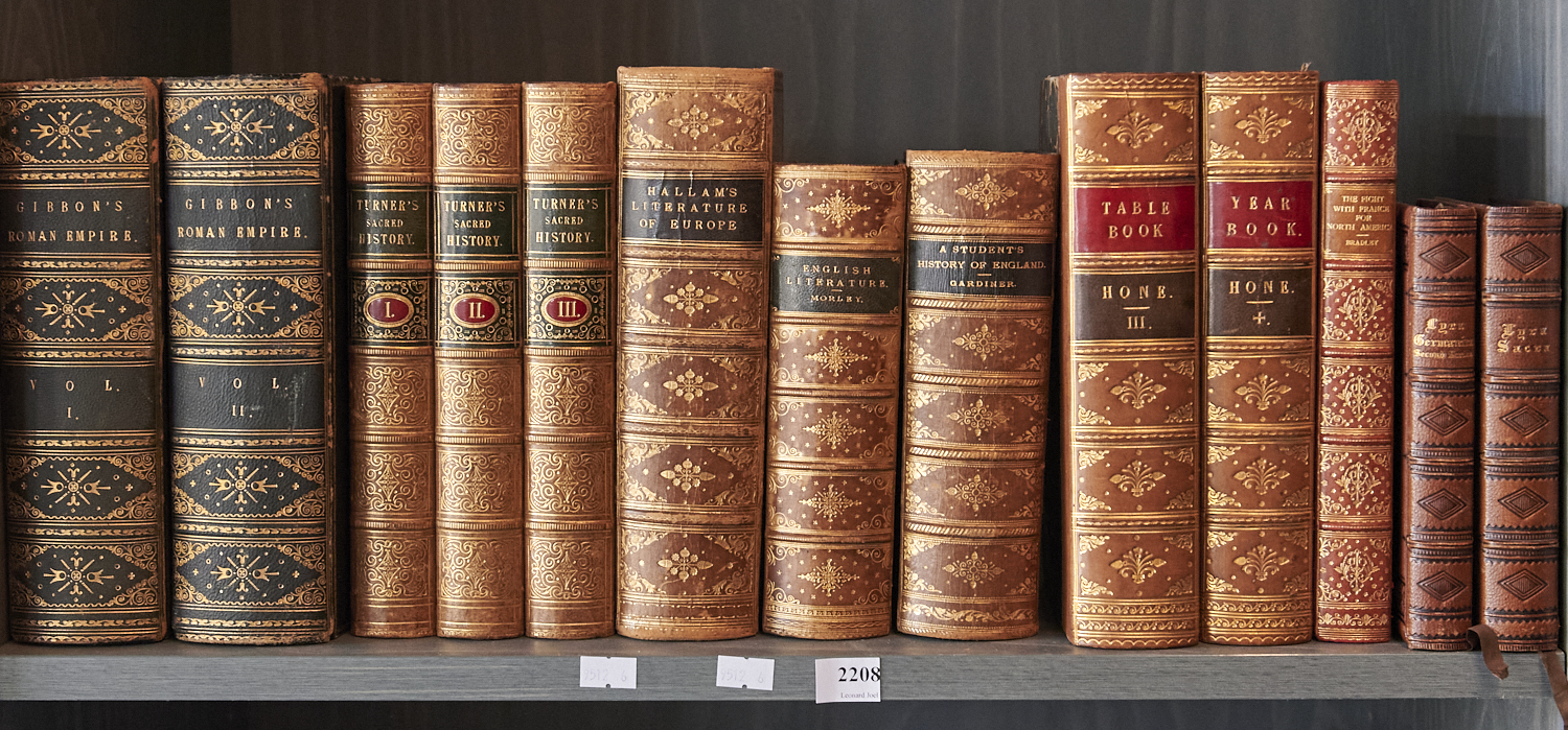 A SHELF OF ANTIQUE BOOKS AND DECORATIVE BINDINGS INCLUDING TURNERS SACRED HISTORY (VOLS 1 TO 3), AND GIBBON'S ROMAN EMPIRE (VOLS 1 AND 2), LEONARD JOEL DELIVERY SIZE: LARGE