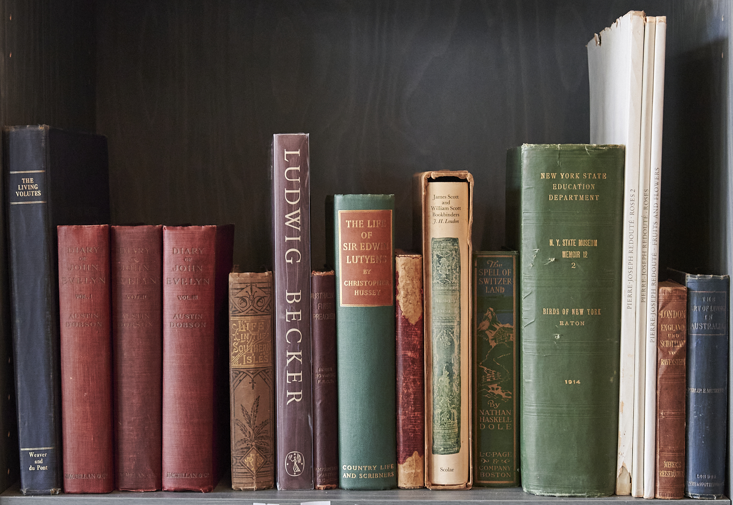 A SHELF OF MISCELLANEOUS BOOKS INCLUDING LUDWIG BECKER, THE LIFE OF SIR EDWIN LUTYENS, AND THE LIVING VOLUTES, LEONARD JOEL DELIVERY SIZE: LARGE