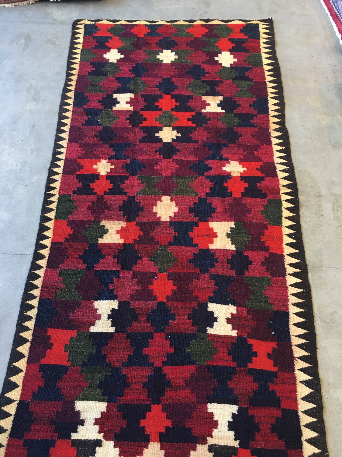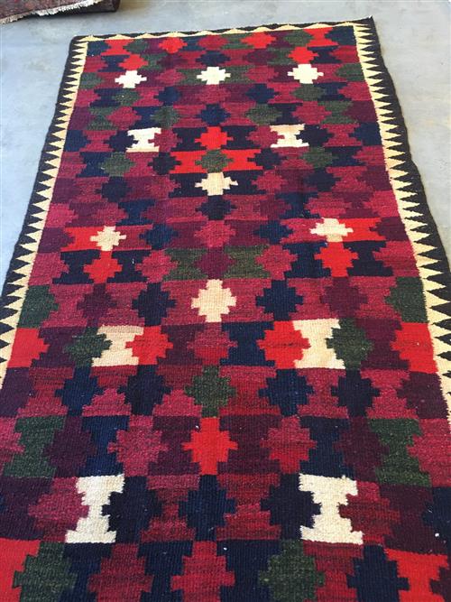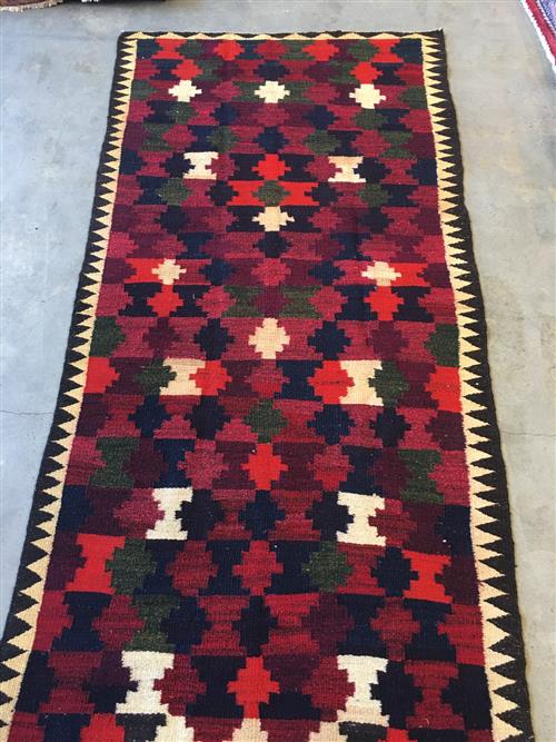 COLOURFUL PERSIAN KURDISH KILIM, GEOMETRIC NOMADIC MOTIFS, 100% HAND KNOTTED WOOL AND COTTON BASE WEAVE, ORGANIC DYES, REVERSABLE, SIZE: 302 X 150 CM- ORIGIN: PERSIA- RRP: $850 DOCUMENTATION OF AUTHENTICITY INCLUDED.
